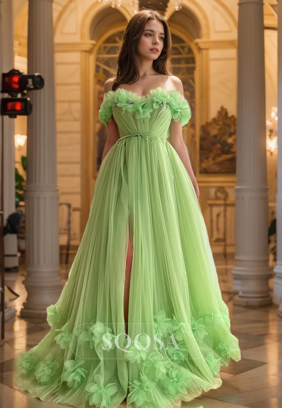 Scoop-Neck Off-Shoulder Tulle A-Line Prom Dress Pleated Beaded Slit Train Party Gowns with Floral Embellished