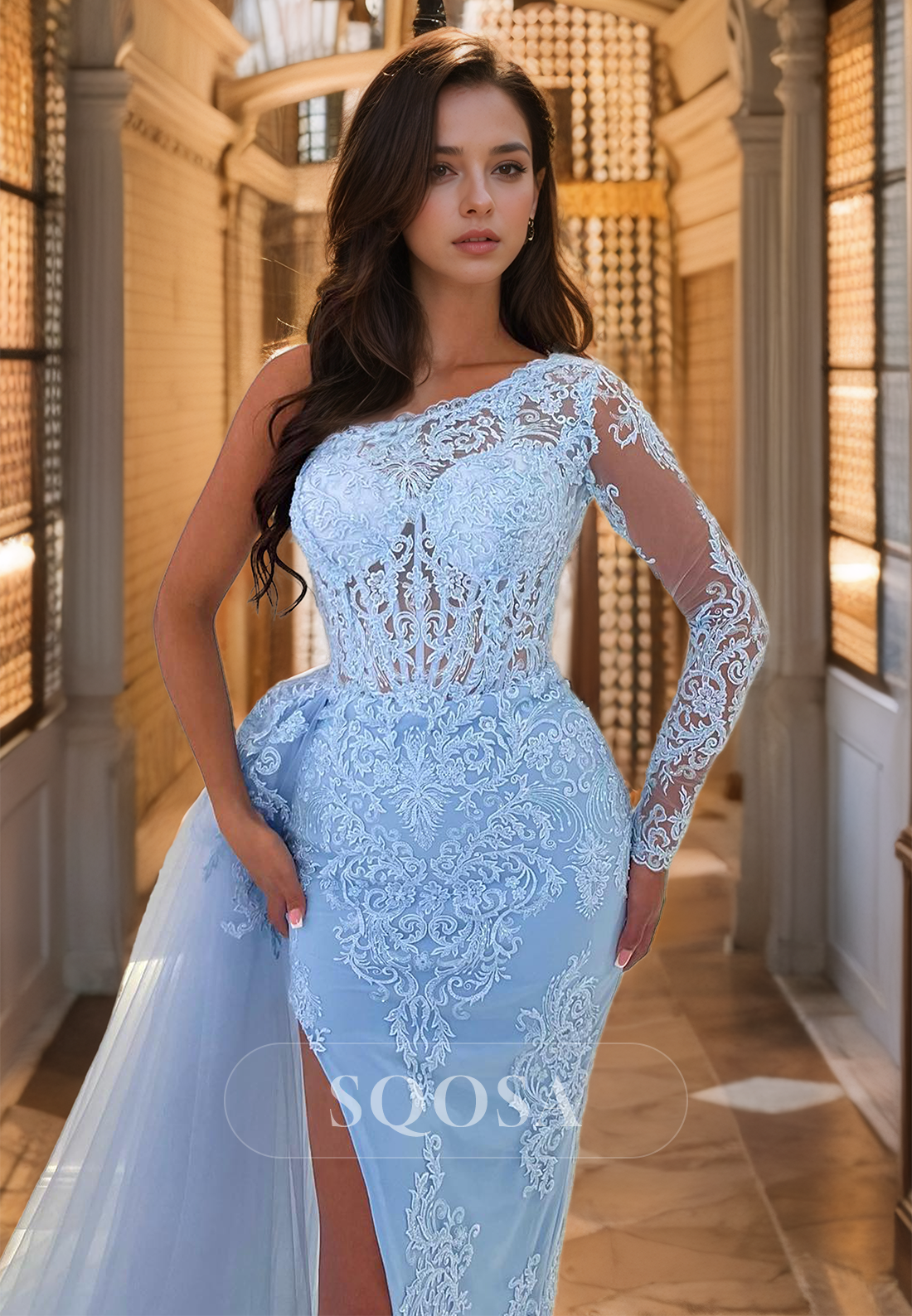 Asymmetrical-Neck One-Long-Sleeve Allover Lace Applique Cutout Mermaid Prom Dress with Tulle Train