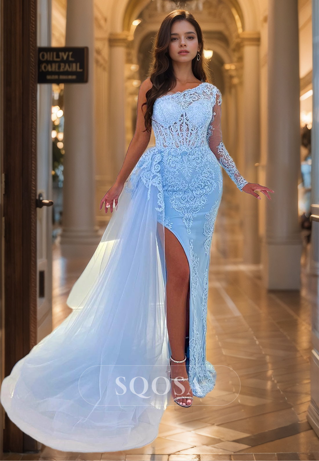 Asymmetrical-Neck One-Long-Sleeve Allover Lace Applique Cutout Mermaid Prom Dress with Tulle Train x 1;
