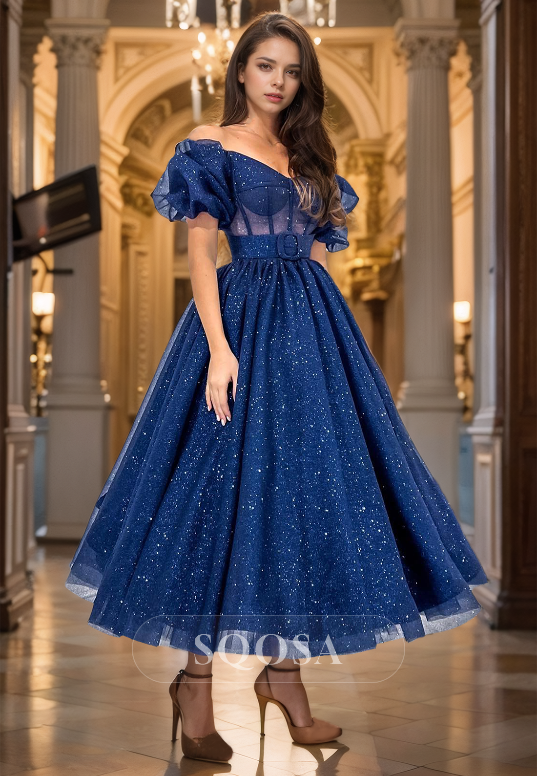 Off-Shoulder V-Neck Pleated A-Line Prom Dress Pleated Sheer Glitter-Knit Midi Formal Evening Gowns x 1;