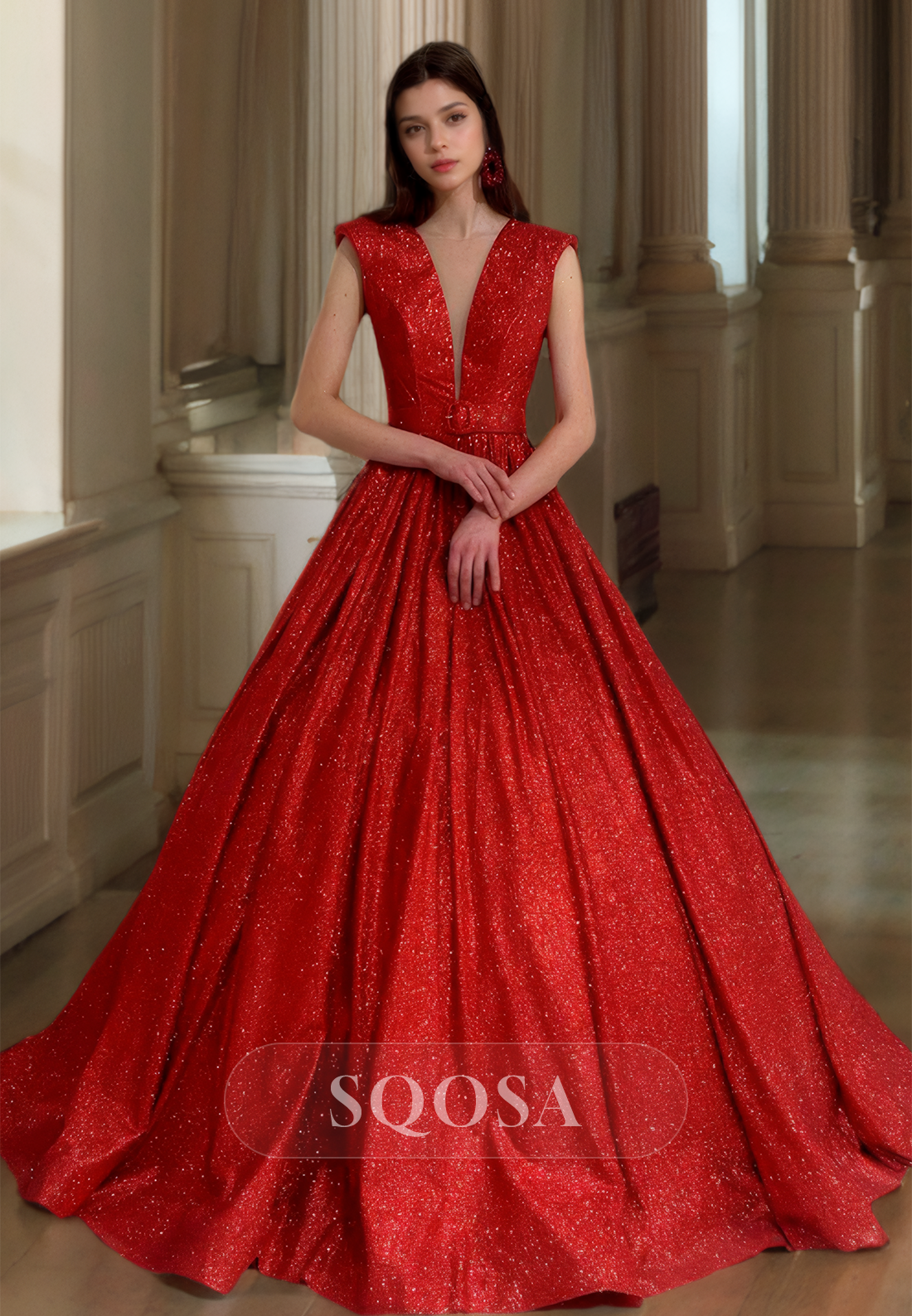 Deep V-Neck Sleeveless A-Line Formal Prom Dress Pleated Glitter-Knit Evening Gowns with Train x 1;