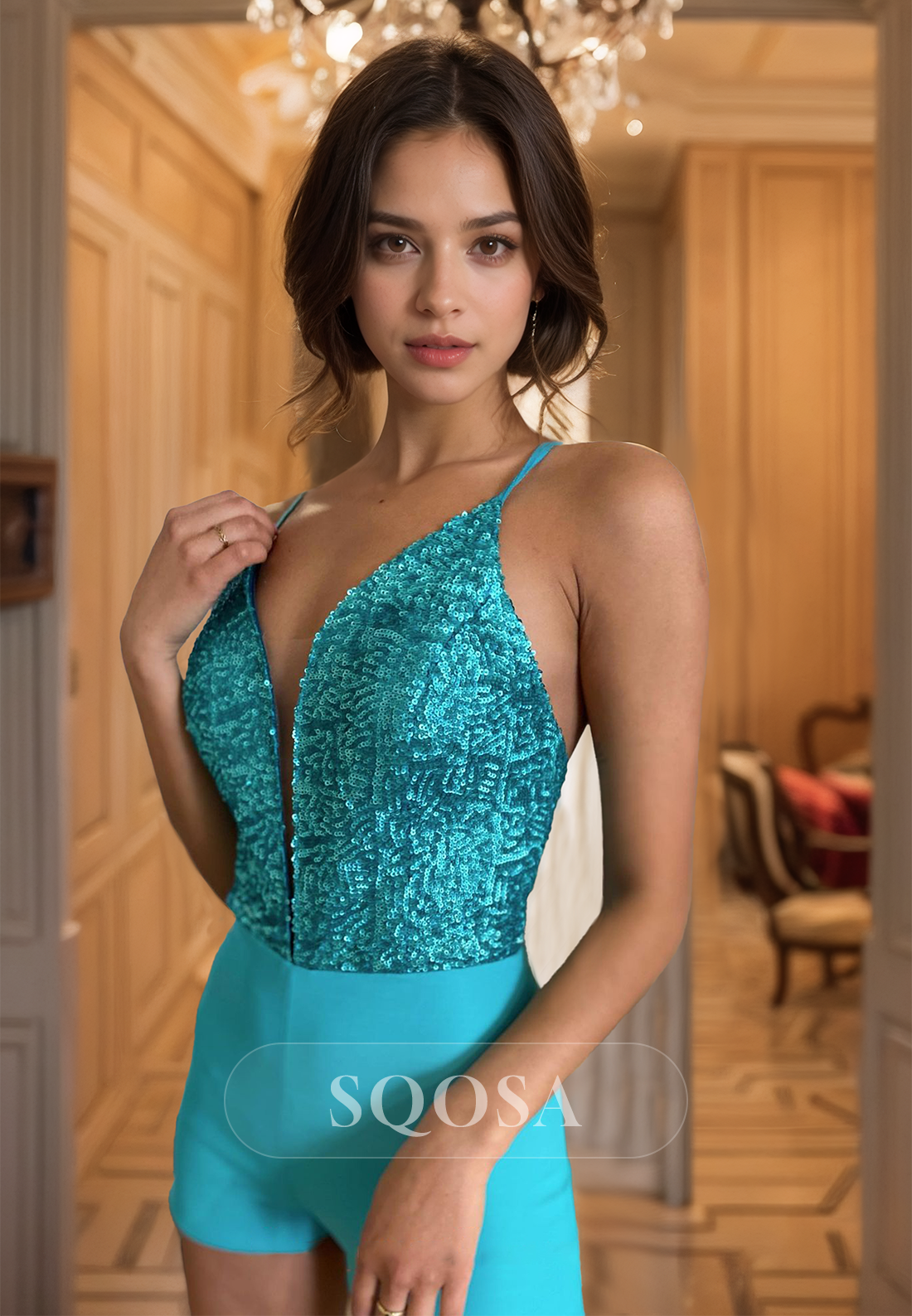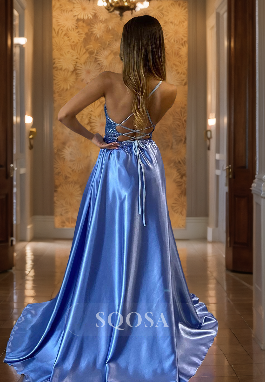 Deep V-Neck Spaghetti Straps Sleeveless Formal Gowns Sequined Pleated Satin A-Line Prom Dress x 1;