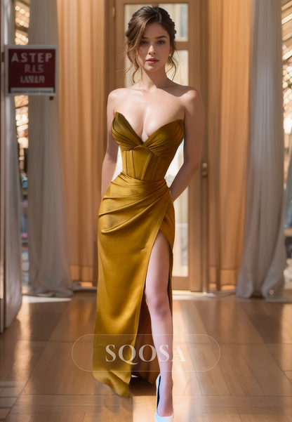 Effortless elegance meets modern style in our Pleated Sweetheart Off-Shoulder Sleeveless Floor-Length Mermaid Prom Dress. The sweetheart neckline and off-shoulder design beautifully flatters the décolletage while the pleated details and high slit add a touch of playful sophistication. Perfect for any formal occasion.
