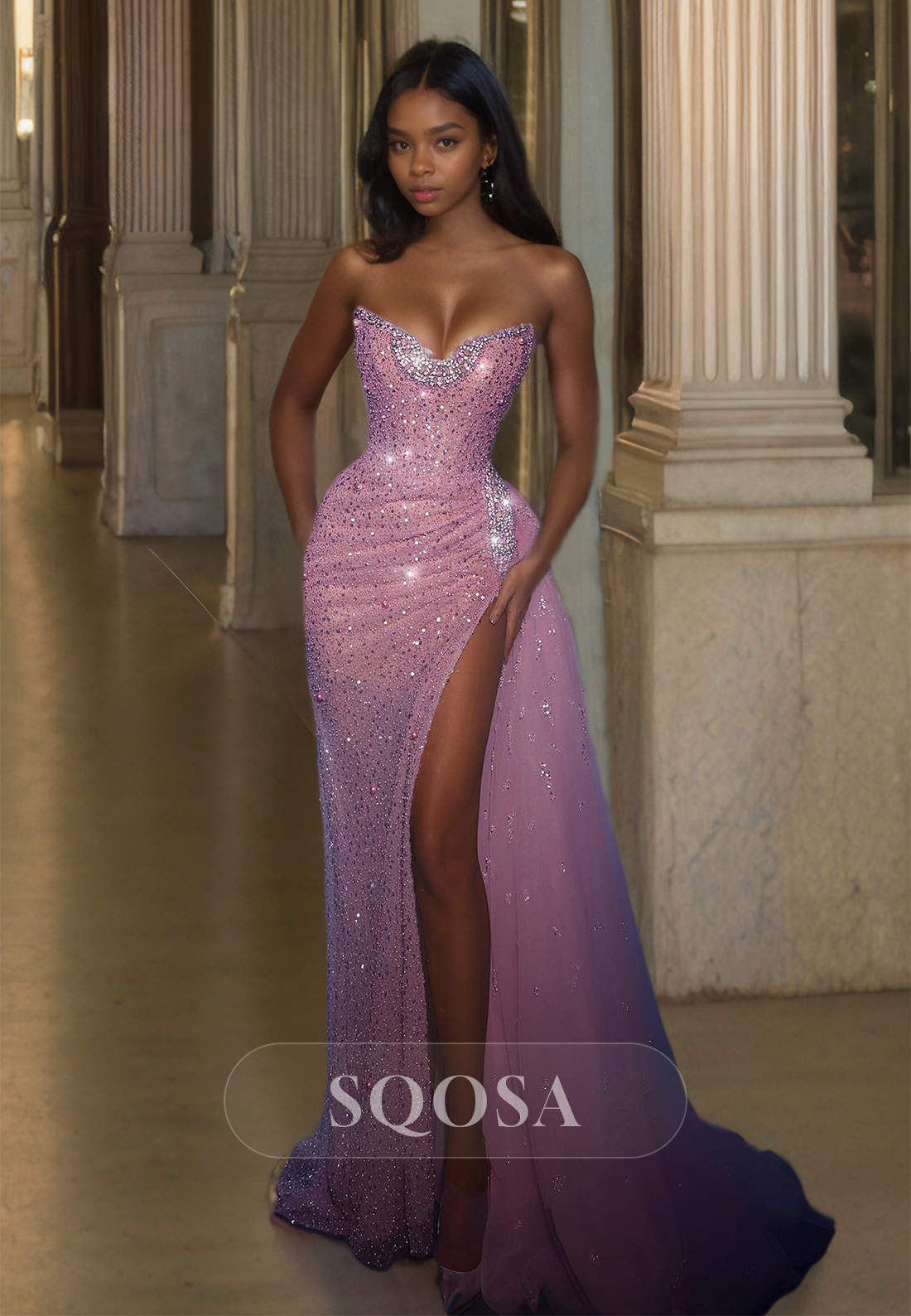 Beaded Sweetheart Off-Shoulder Sleeveless Sequined High Slit Pleated Mermaid Prom Dress with Train
