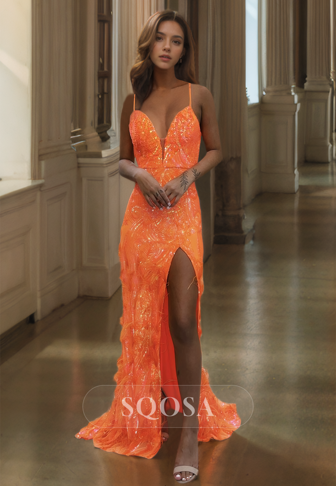 Spaghetti Straps V-Neck Sleeveless Mermaid Prom Dress Allover Lace Fringed Party Gowns with High Slit