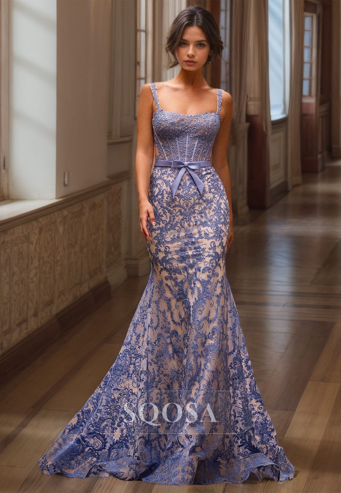 This elegant prom dress features delicate spaghetti straps and a sleeveless design adorned with intricate lace appliques. The mermaid silhouette is complemented by a stunning sweep train and beaded cutouts, making it the perfect choice for a formal occasion.