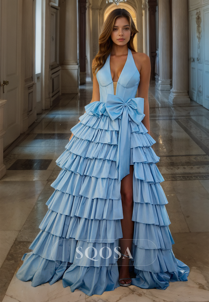 Halter Deep V-Neck Sleeveless A-Line Prom Dress High Slit Tiered Formal Gowns with Bow