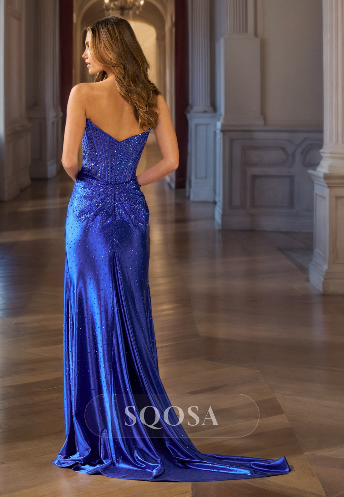 Scoop-Neck Off-Shoulder Beaded Party Gowns Sleeveless Pleated Sweep Train Prom Dress with High Slit