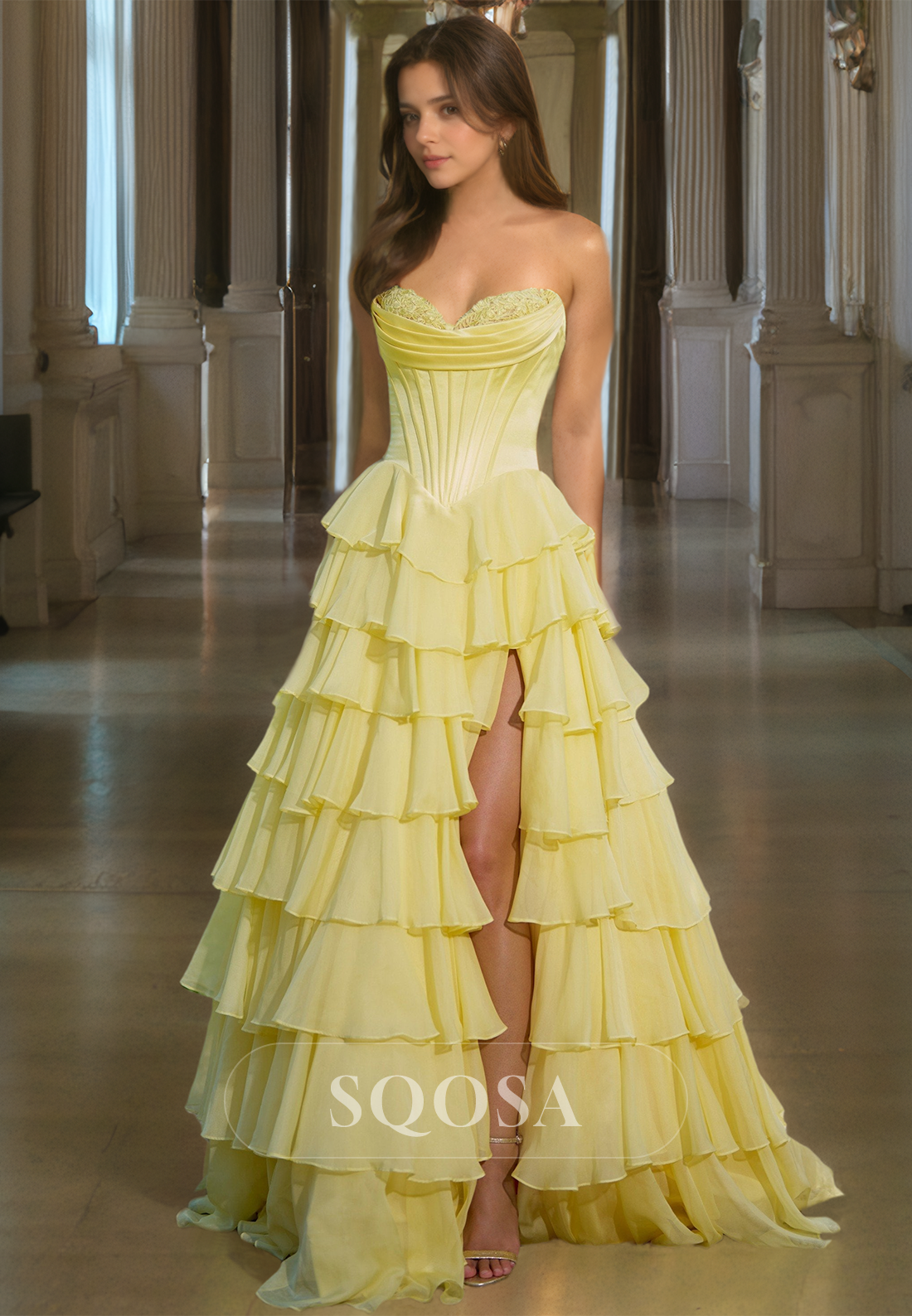 Beaded Sweetheart Sleeveless Chiffon A-Line Prom Dress Off-Shoulder Tiered Evening Gowns with High Slit