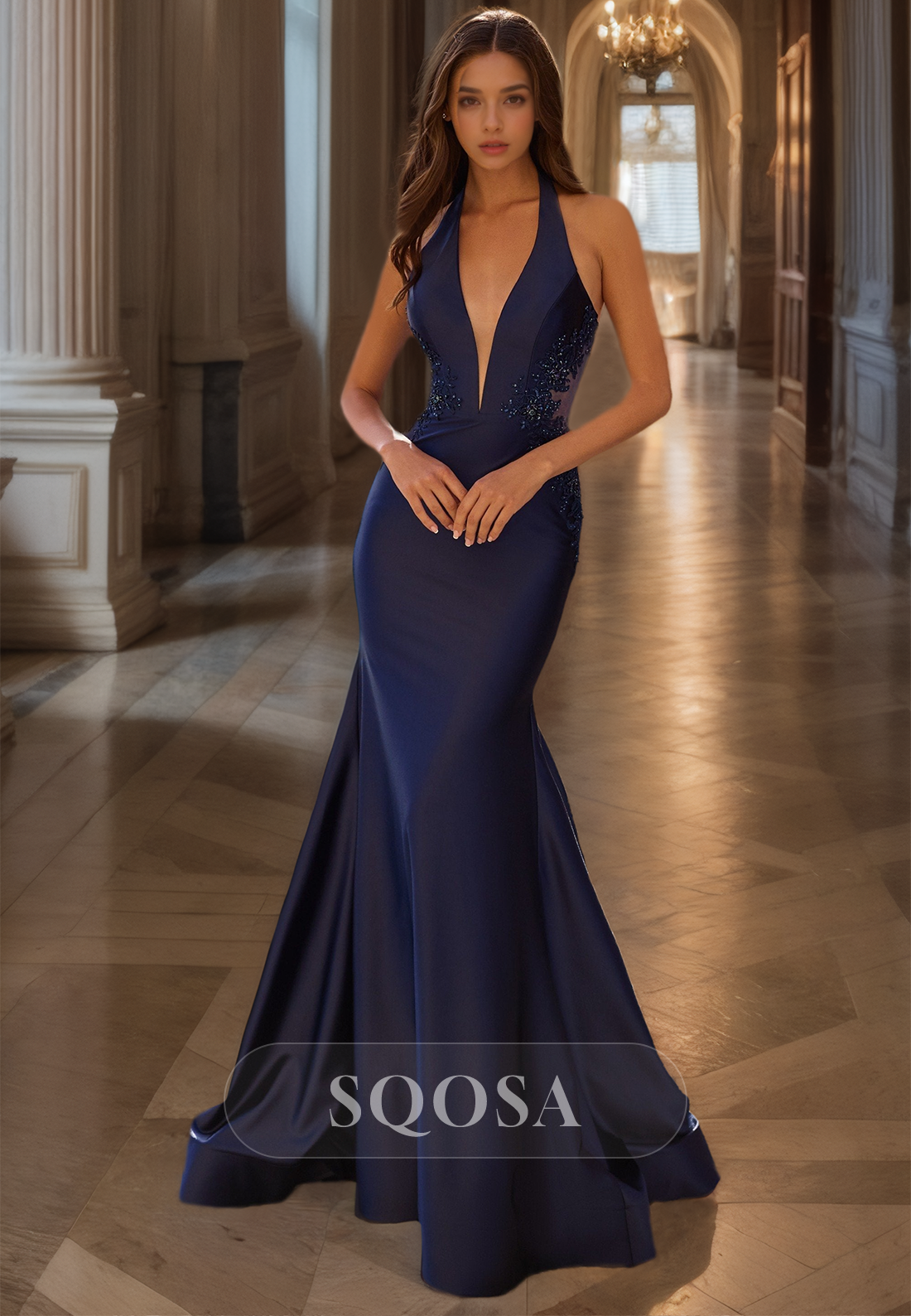 Halter Deep V-Neck Sleeveless Satin Formal Gowns Beaded Floor-Length Mermaid Prom Dress