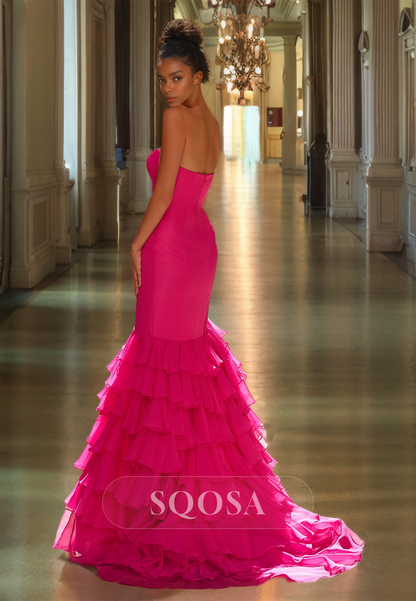 Tube Top Off-Shoulder Sleeveless High Slit Mermaid Prom Dress with Chiffon Tiered Train