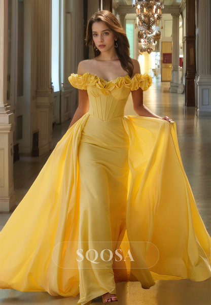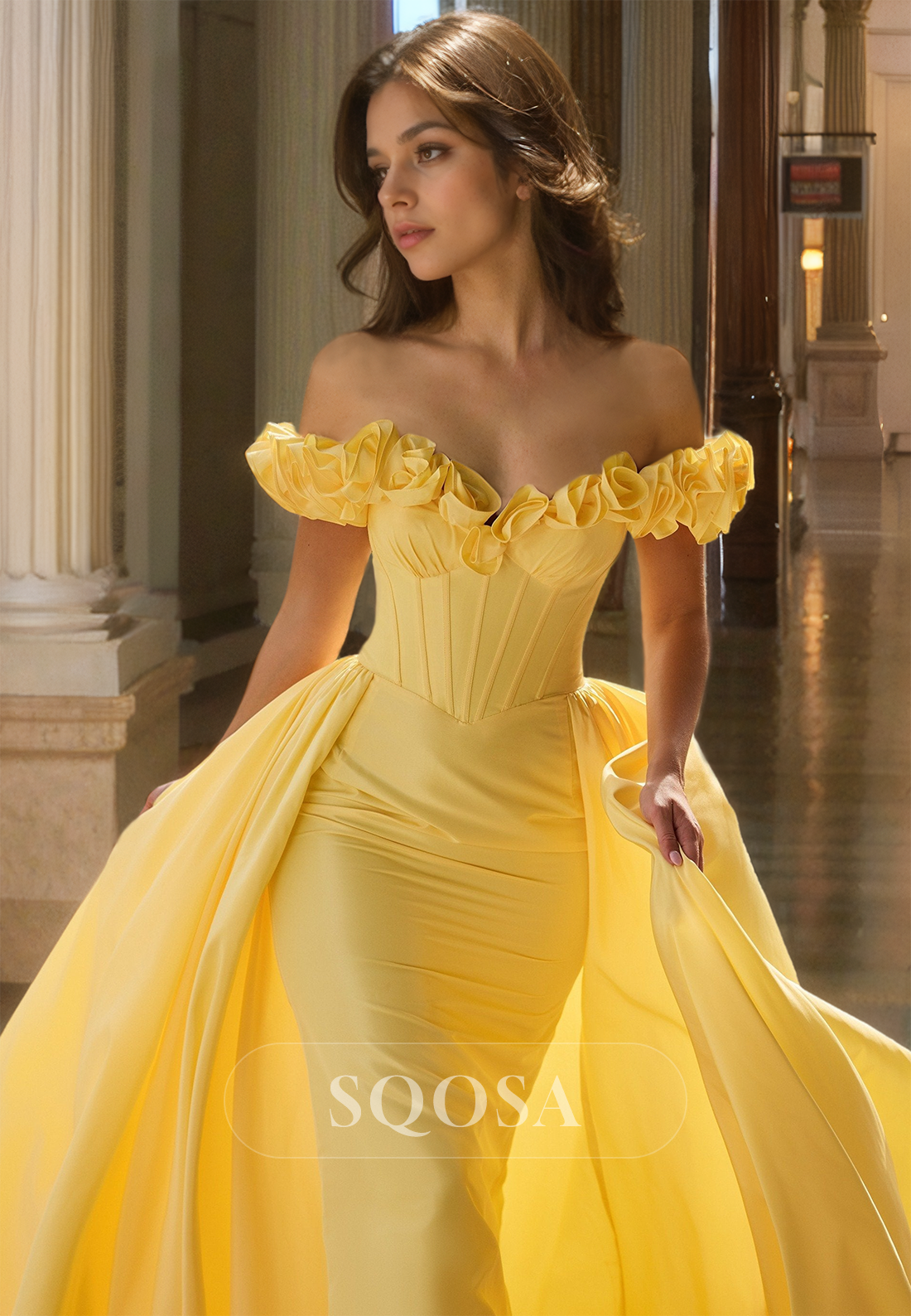 Floral Embossed Sweetheart Off-Shoulder Party Gowns Pleated Satin Mermaid Prom Dress with Overskirt