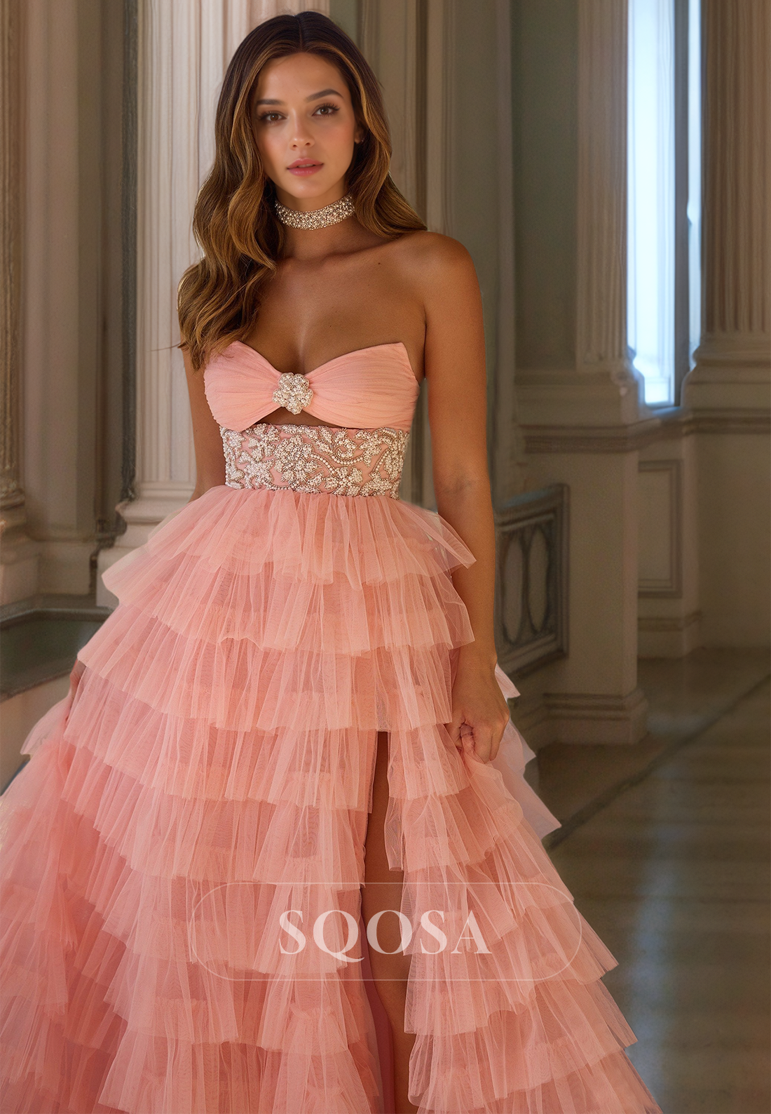 Off-Shoulder Sweetheart Sleeveless Evening Gowns Beaded Tiered High Slit Tulle A-Line Prom Dress