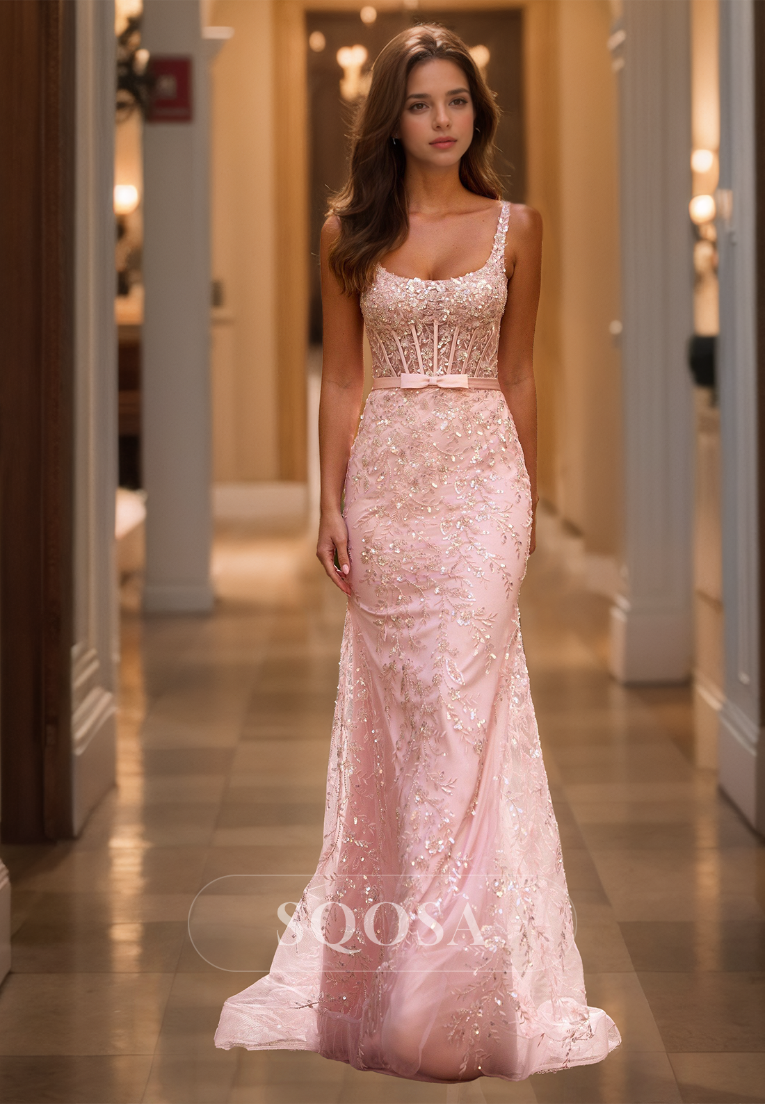 Scoop-Neck Spaghetti Straps Sleeveless Party Gowns Sequined Lace Applique Mermaid Prom Dress