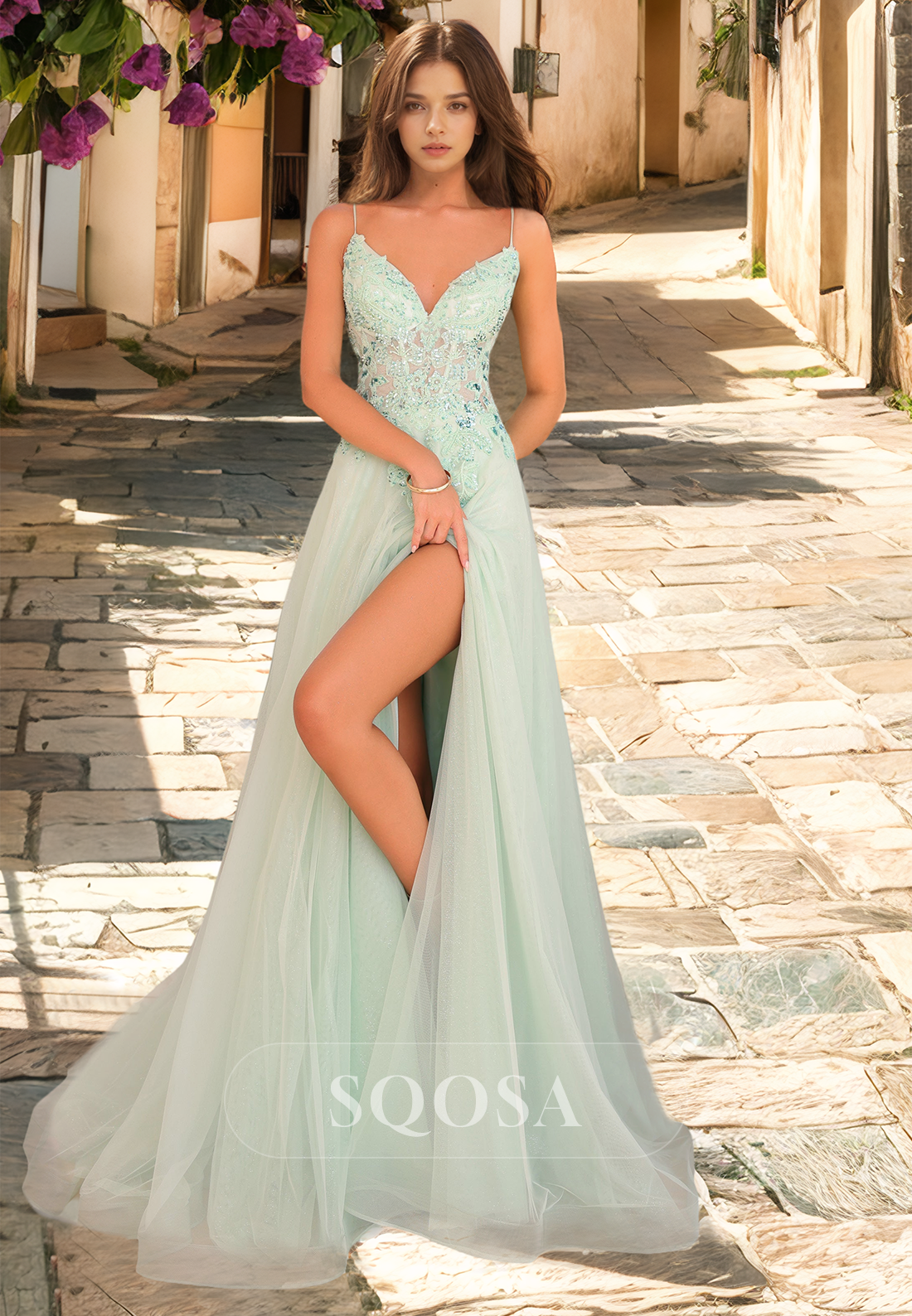 V-Neck Spaghetti Straps Sleeveless A-Line Prom Dress Beaded Applique Pleated Party Gowns with High Slit