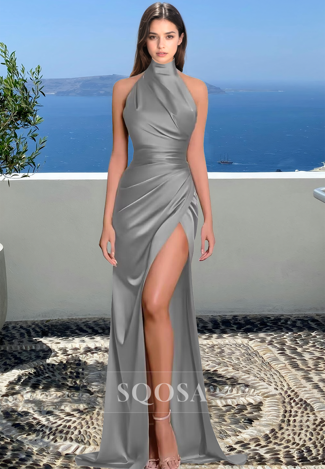 Simple Halter-Neck Off-Shoulder Formal Dress Sleeveless Pleated High Slit Mermaid Prom Dress