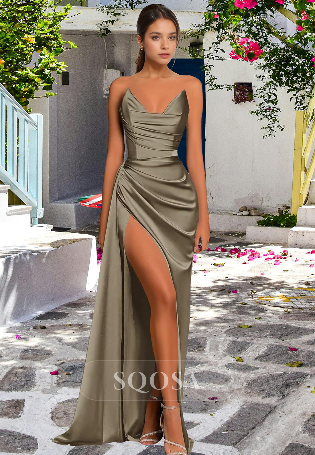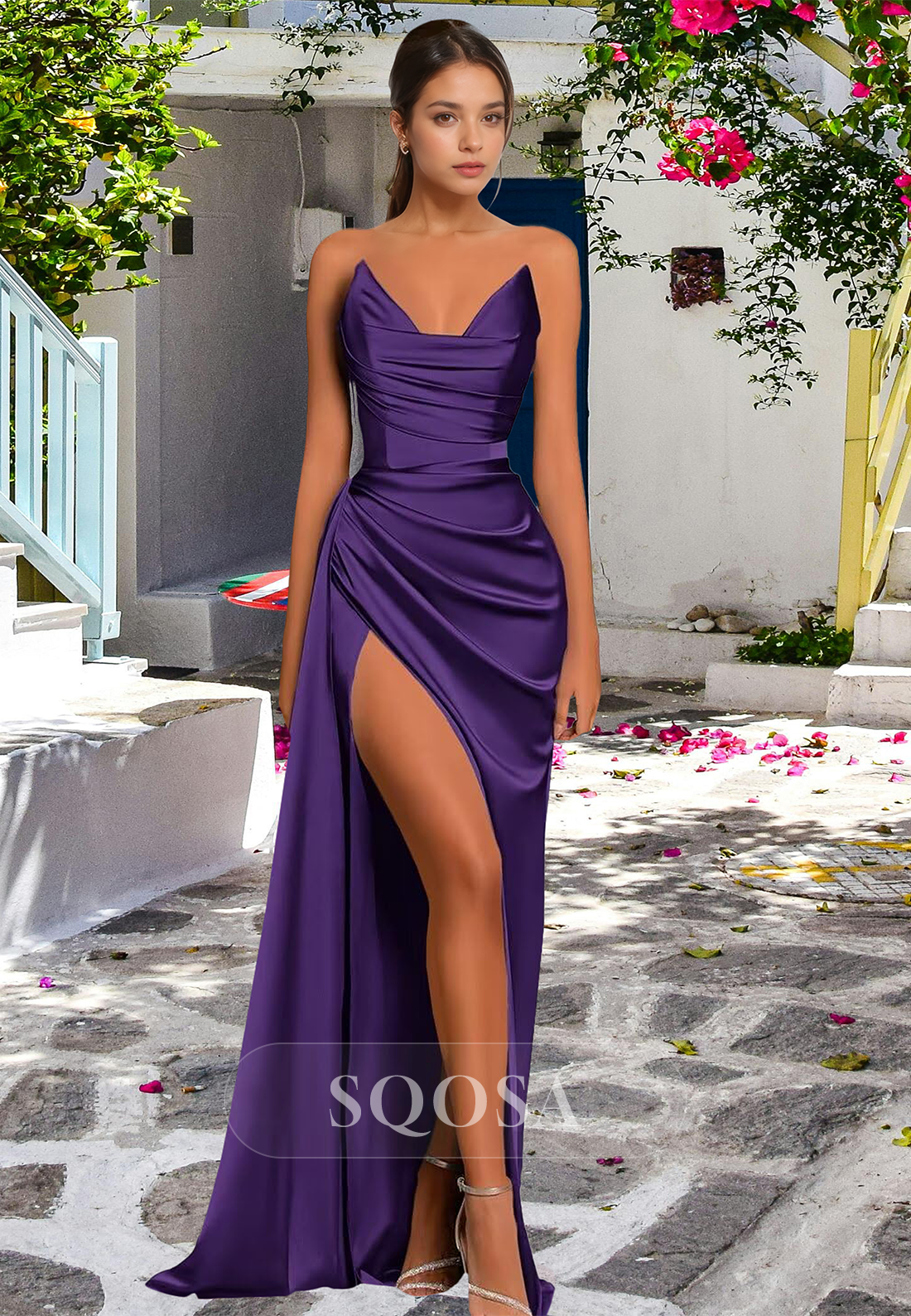 This elegant V-neck off-shoulder sleeveless dress is perfect for any formal event. The pleated design and high slit offer a sophisticated touch, while the satin mermaid silhouette adds a touch of glamour. Ideal for proms and parties, this dress is sure to make a lasting impression.
