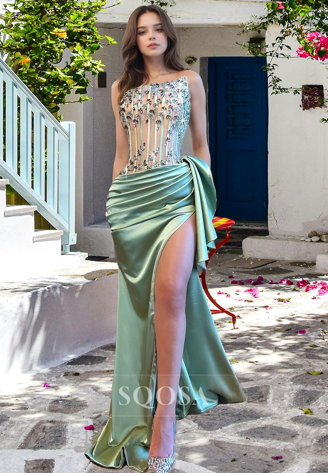 Scoop-Neck Off-Shoulder Sleeveless Pleated Beaded Jewel High Slit Mermaid Formal Prom Dress x 1;