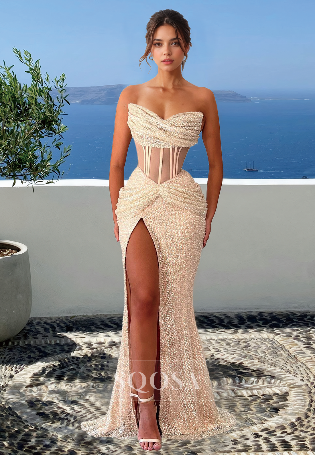 Off-Shoulder Sweetheart Sleeveless Mermaid Prom Dress Glitter-Knit Pleated Party Gowns with High Slit