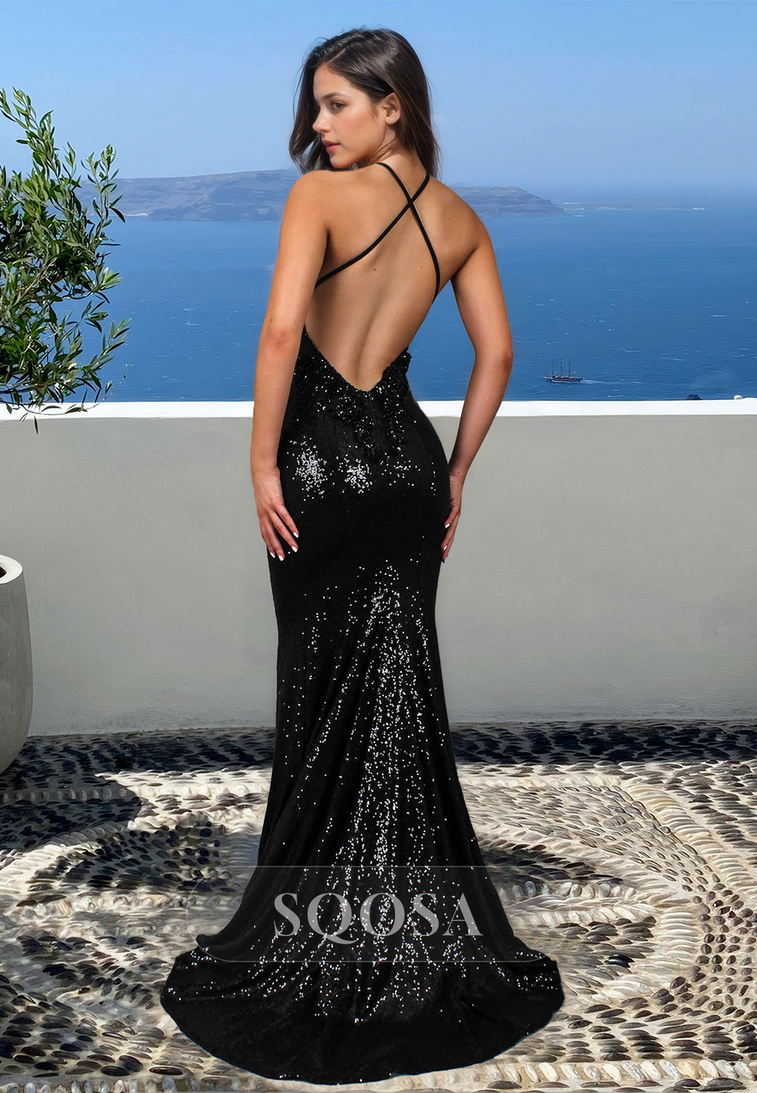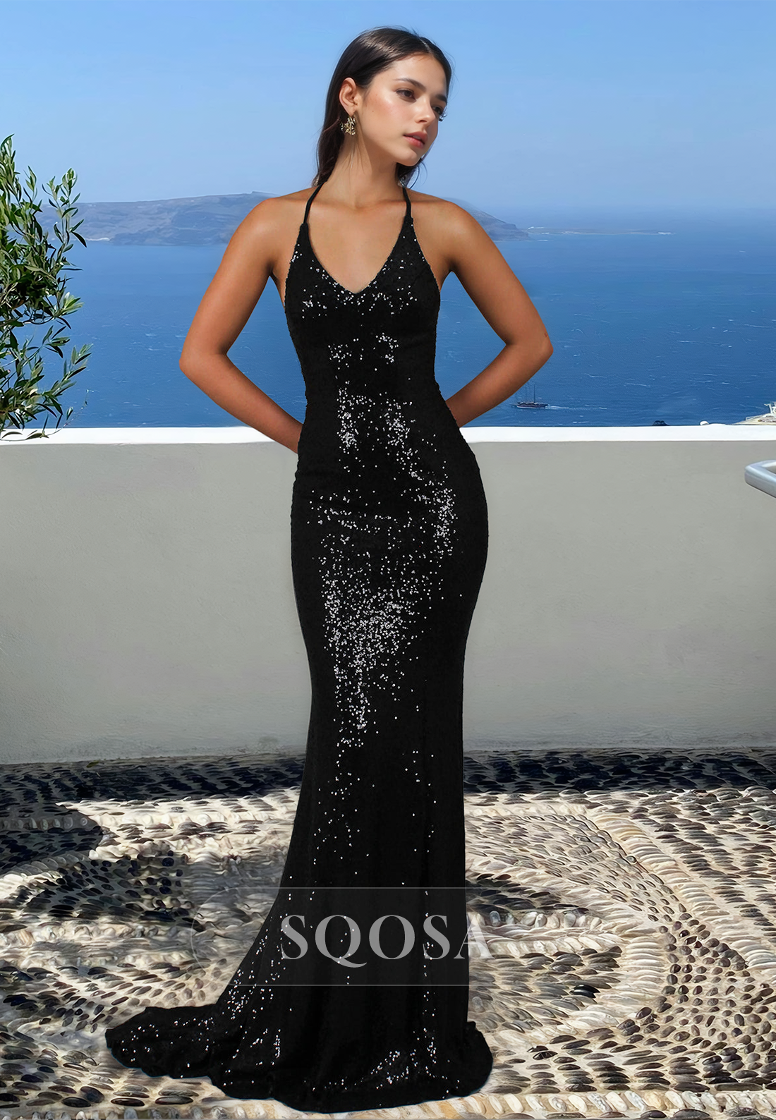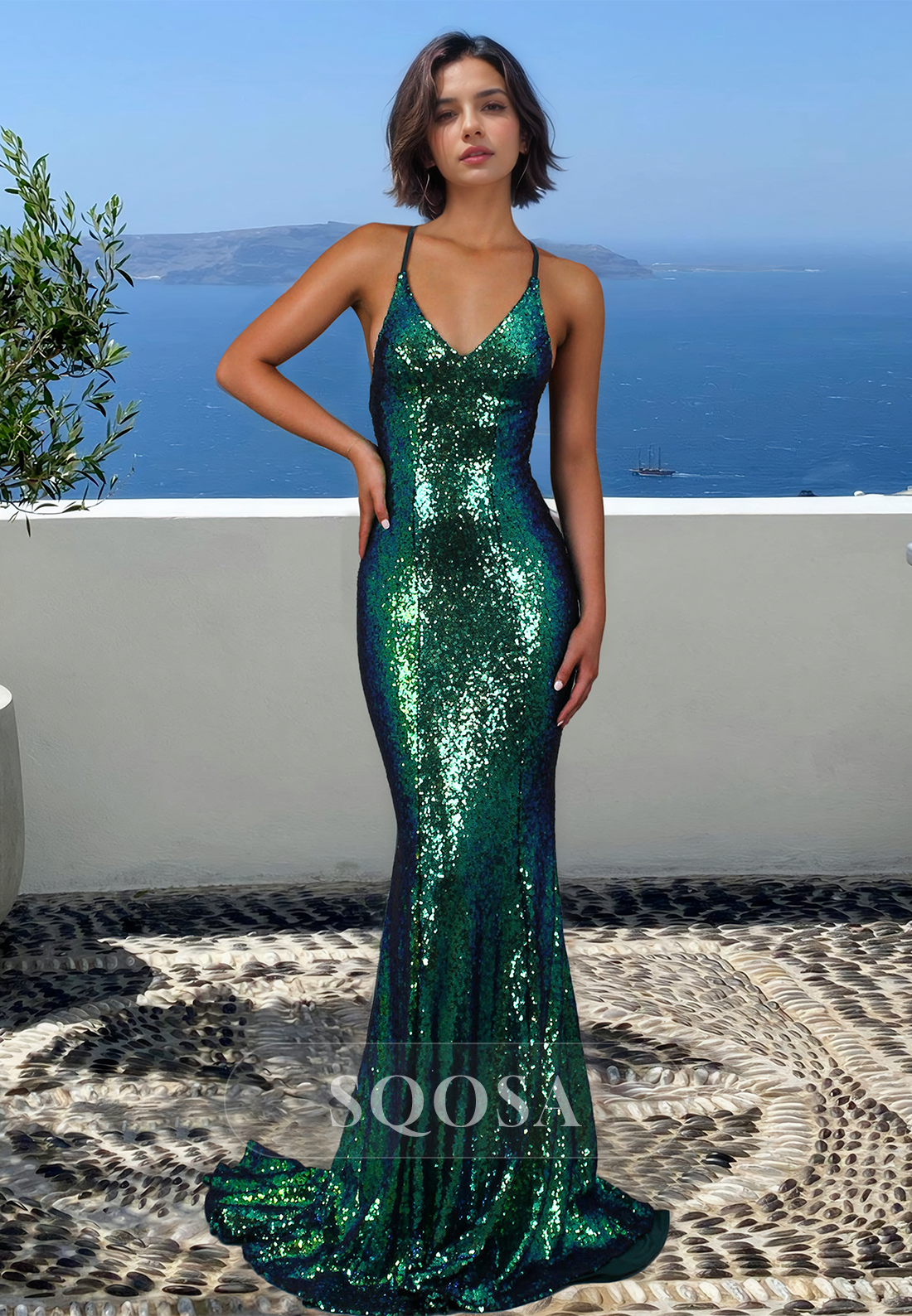 V-Neck Spaghetti Straps Sleeveless Glitter-Knit Sequined Mermaid Prom Dress with Sweep Train
