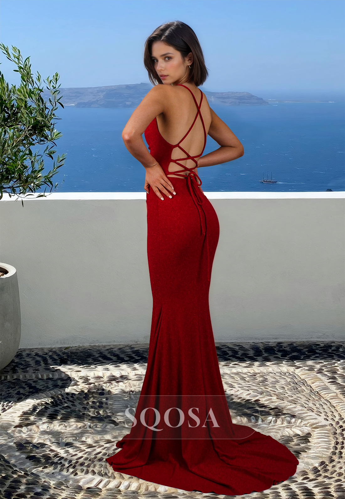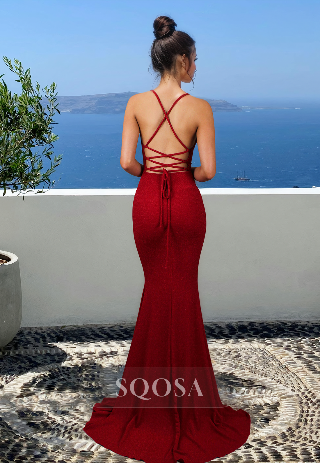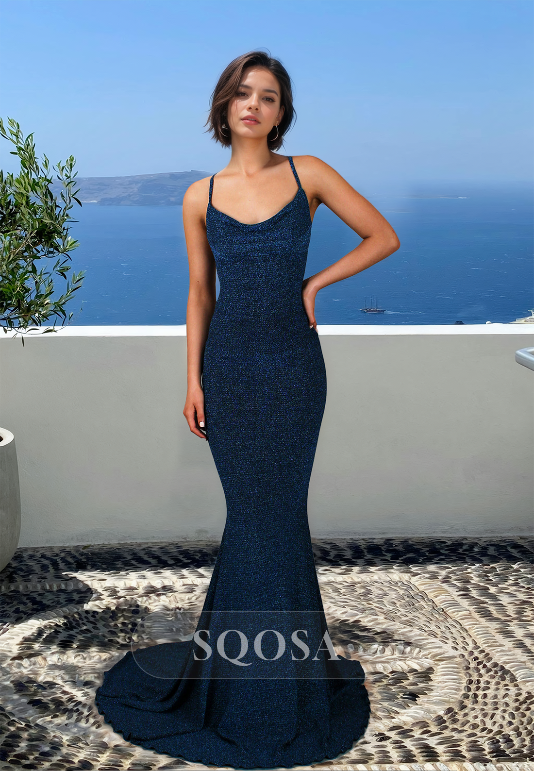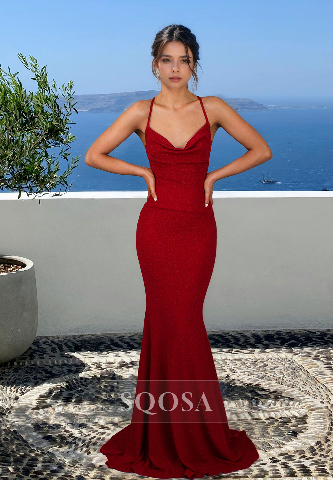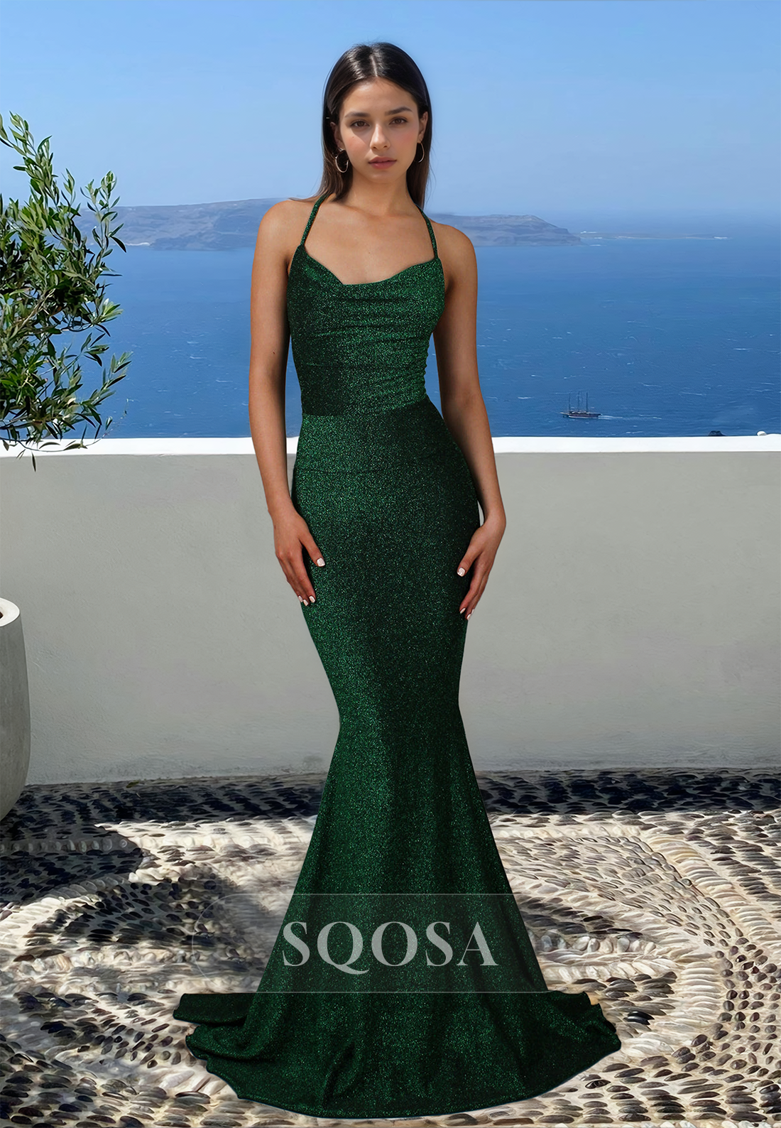 Sweetheart Spaghetti Straps Sleeveless Mermaid Prom Dress Glitter-Knit Pleated Evening Gowns with Sweep Train