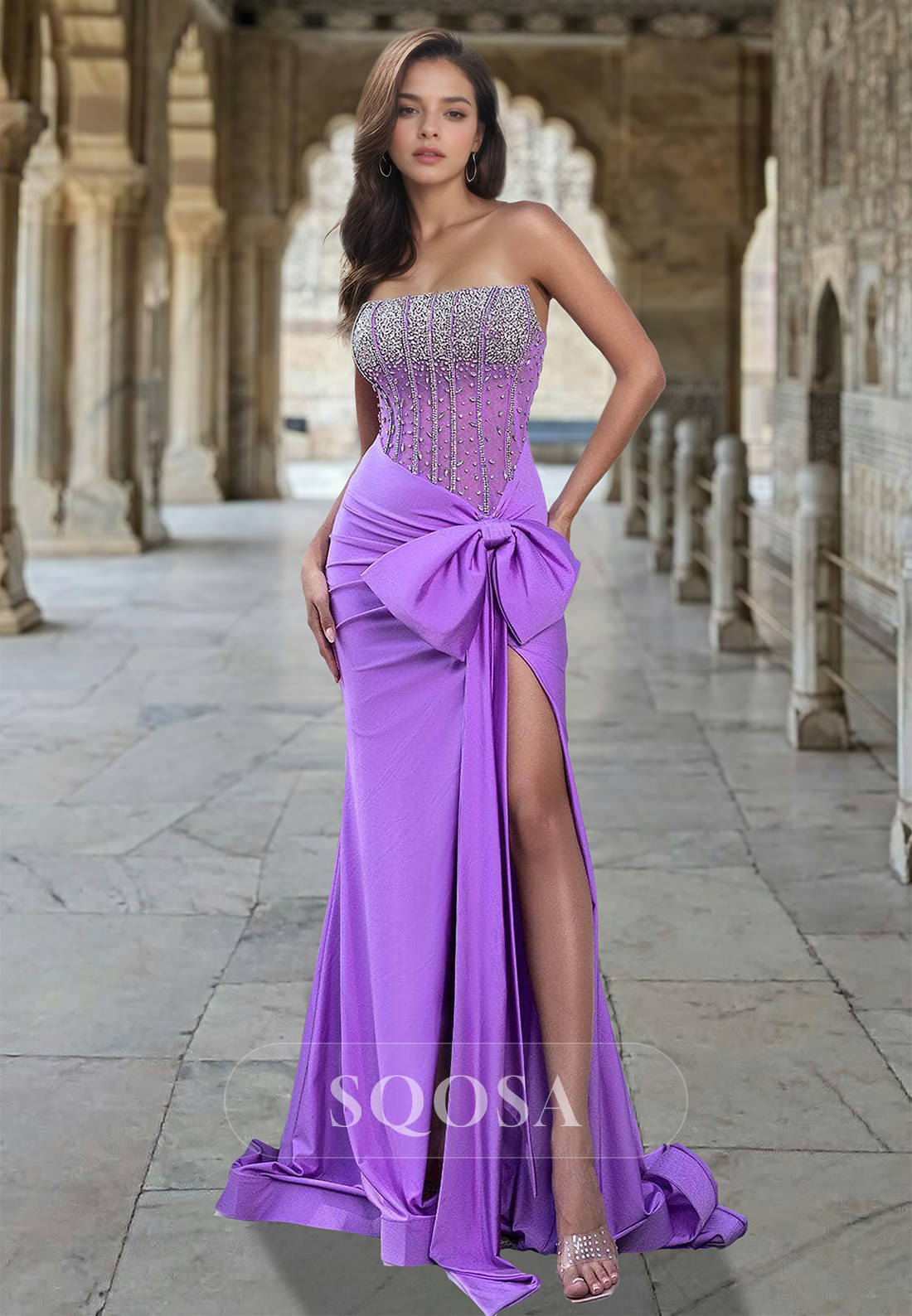 Tube Top Off-Shoulder Sleeveless Bow Formal Gowns Beaded Pleated Mermaid Prom Dress with High Slit