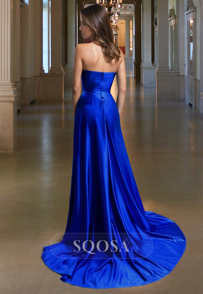 Sweetheart Sleeveless Satin Fitted Prom Dress Pleated High Slit Evening Gowns with Sweep Train