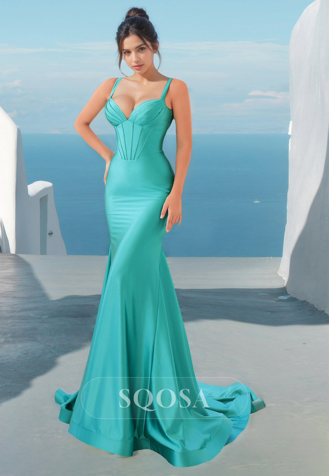 Spaghetti Straps Off-Shoulder Satin Formal Gowns Sweetheart Sleeveless Sweep Train Mermaid Prom Dress x 1;