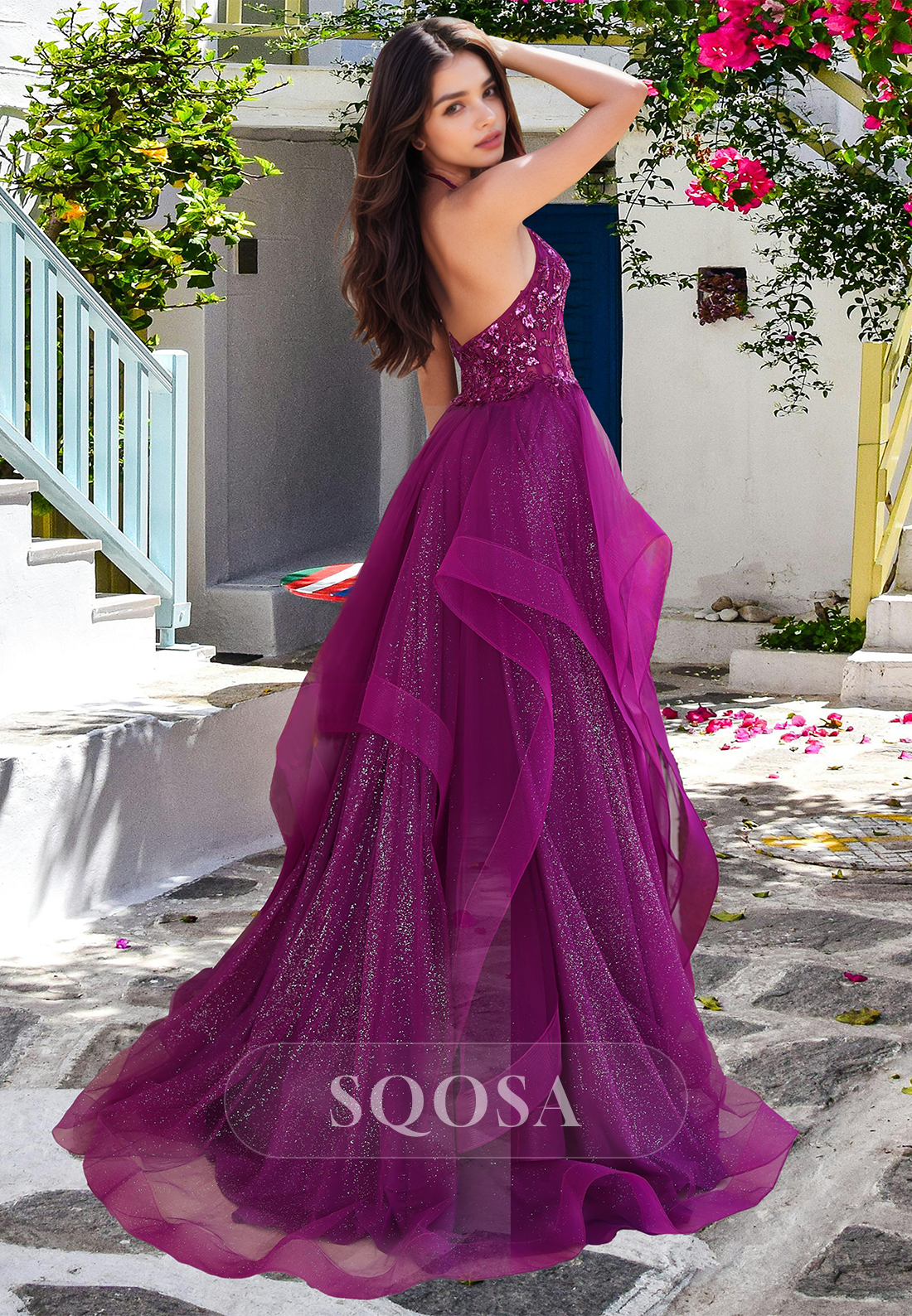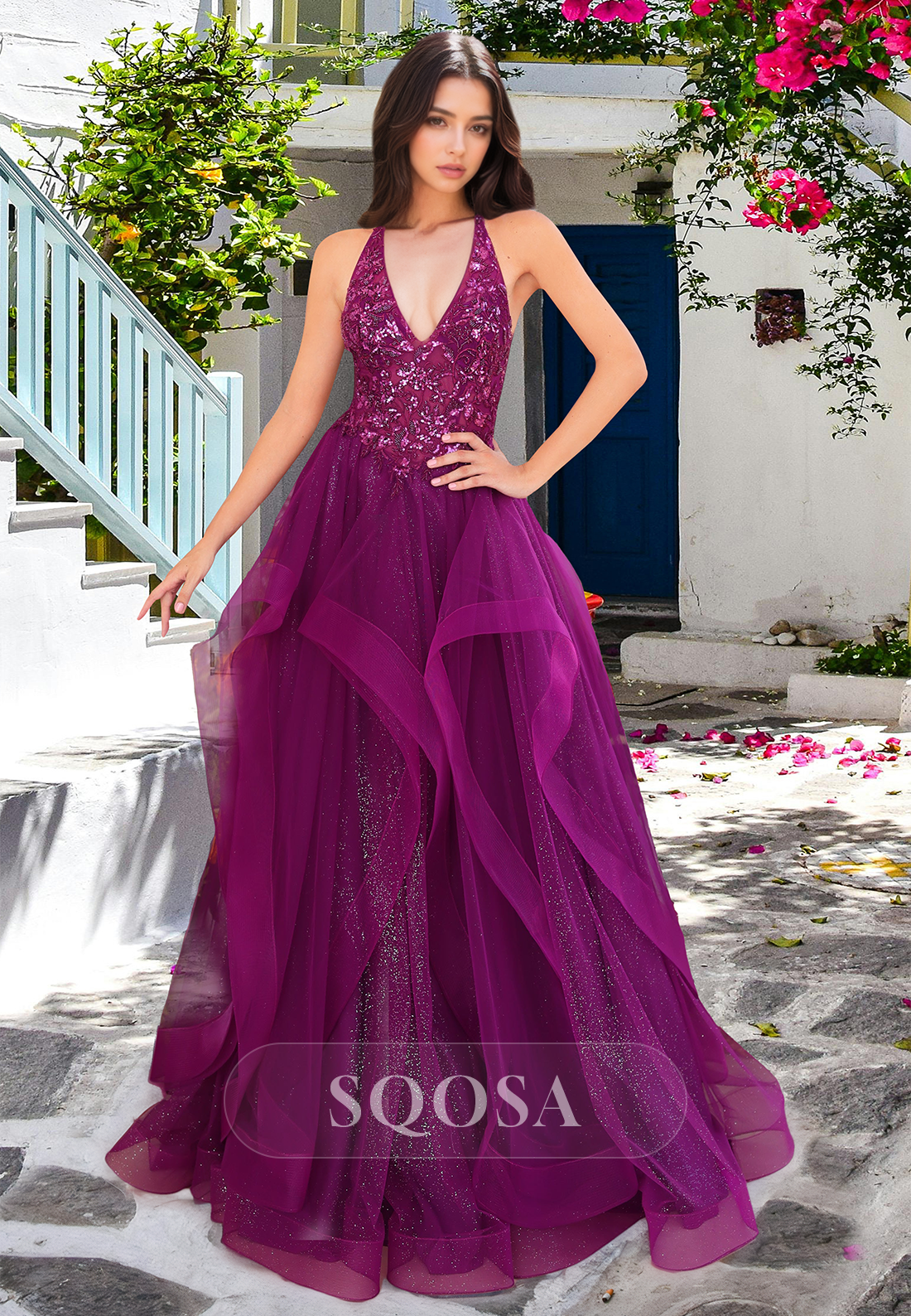 Halter Deep V-Neck Off-Shoulder Sleeveless Formal Gowns Glitter Applique Pleated Tulle A-Line Prom Dress