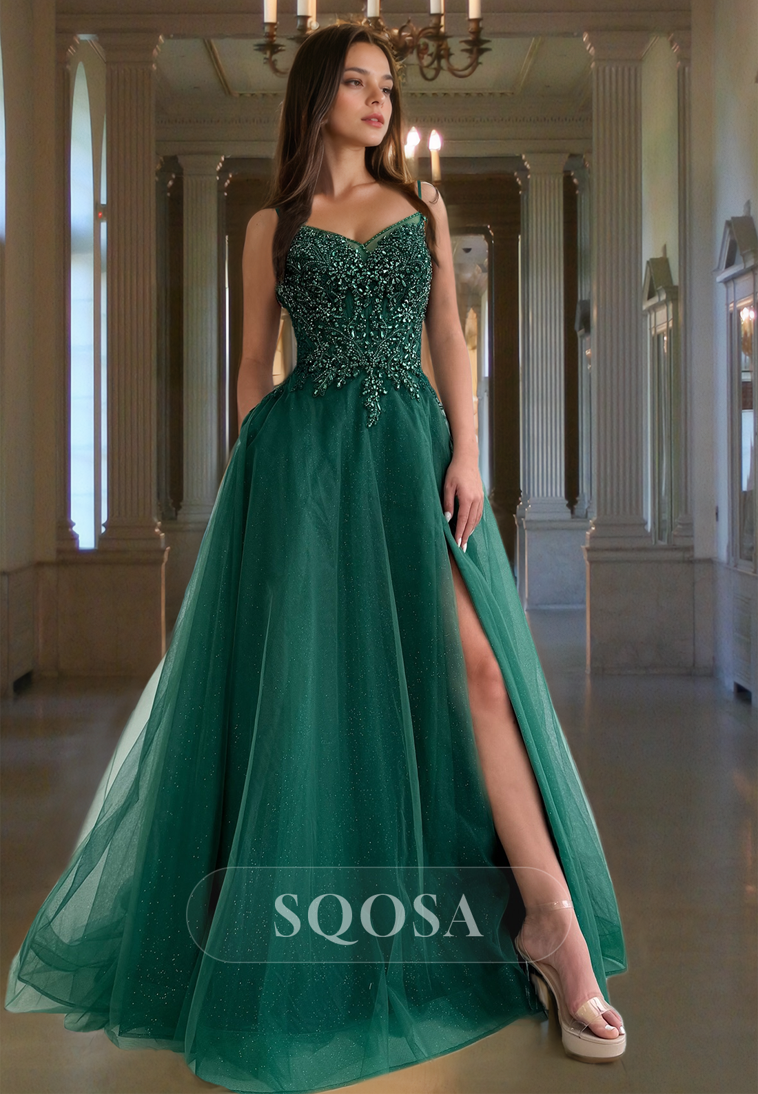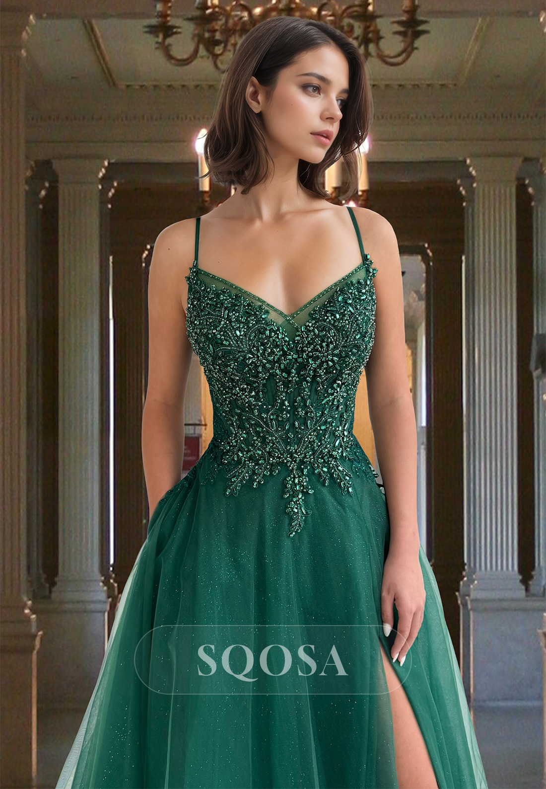A-Line V-Neck Spaghetti Straps Sleeveless Beaded Applique Glitter-Knit Prom Dress with High Slit