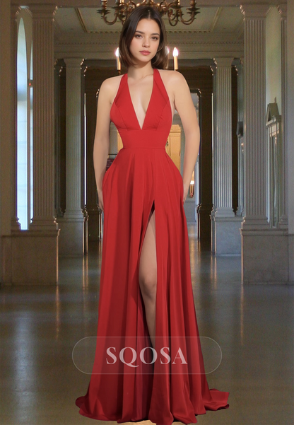 Halter Deep V-Neck Off-Shoulder Sleeveless Floor-Length Satin Fitted Prom Dress with High Slit