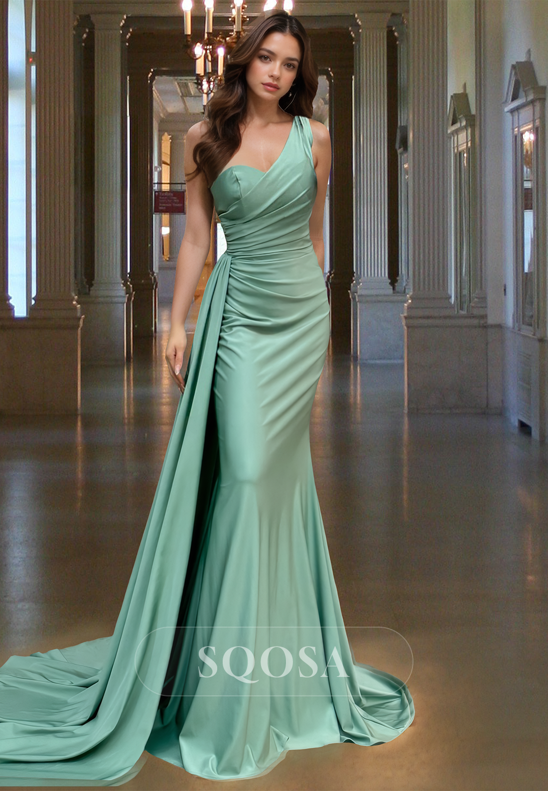 Asymmetrical-Neck Off-Shoulder Sleeveless Mermaid Prom Dress Pleated Sweep Train Formal Gowns