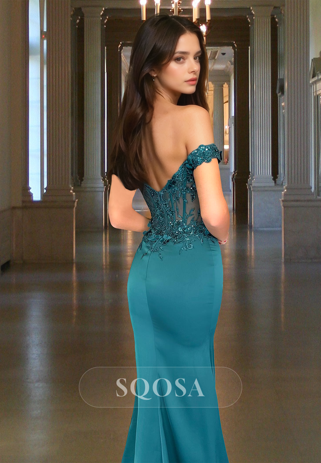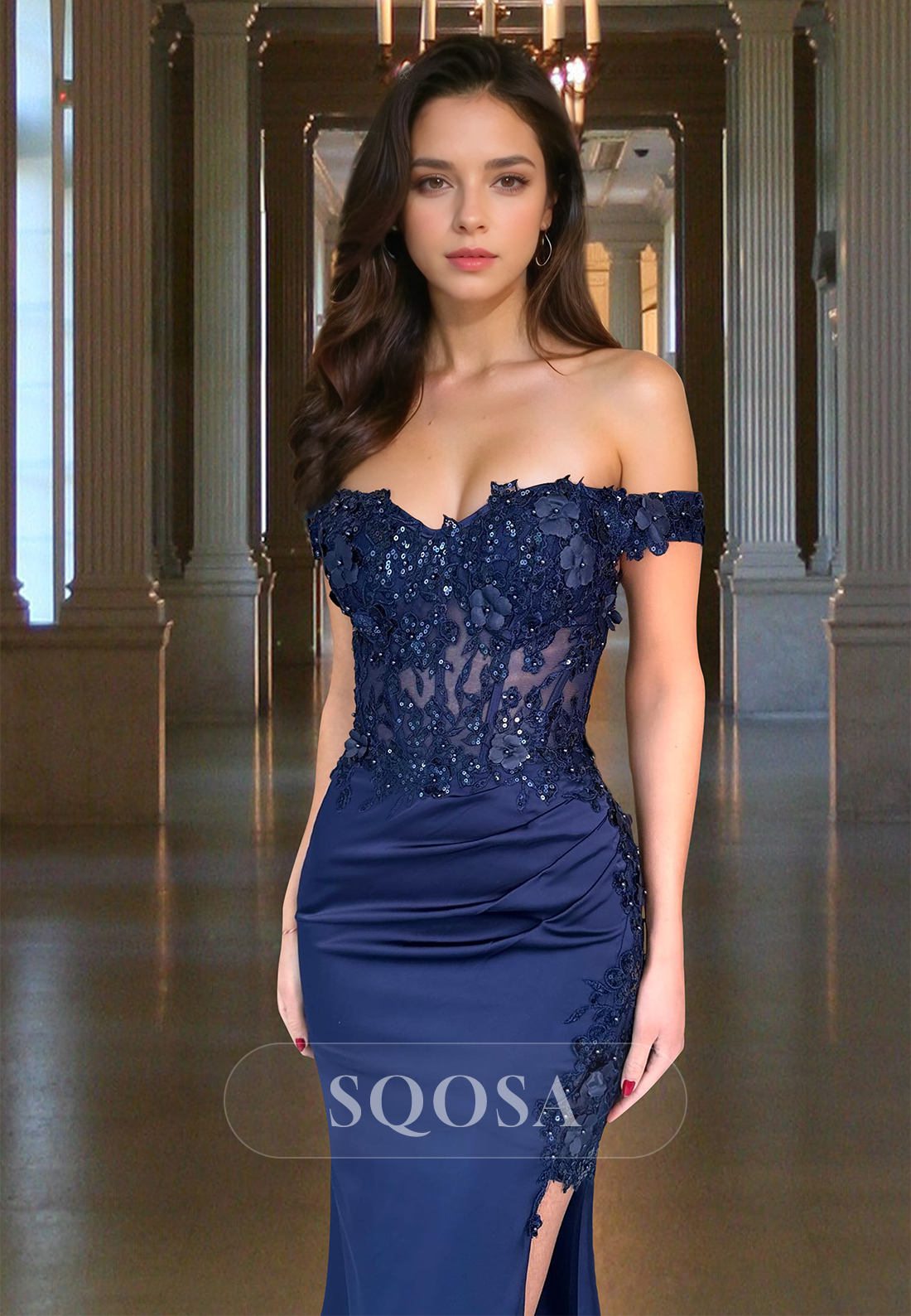 Sweetheart Off-Shoulder Sleeveless Applique Sequins Beaded Pleated Mermaid Prom Dress with Train