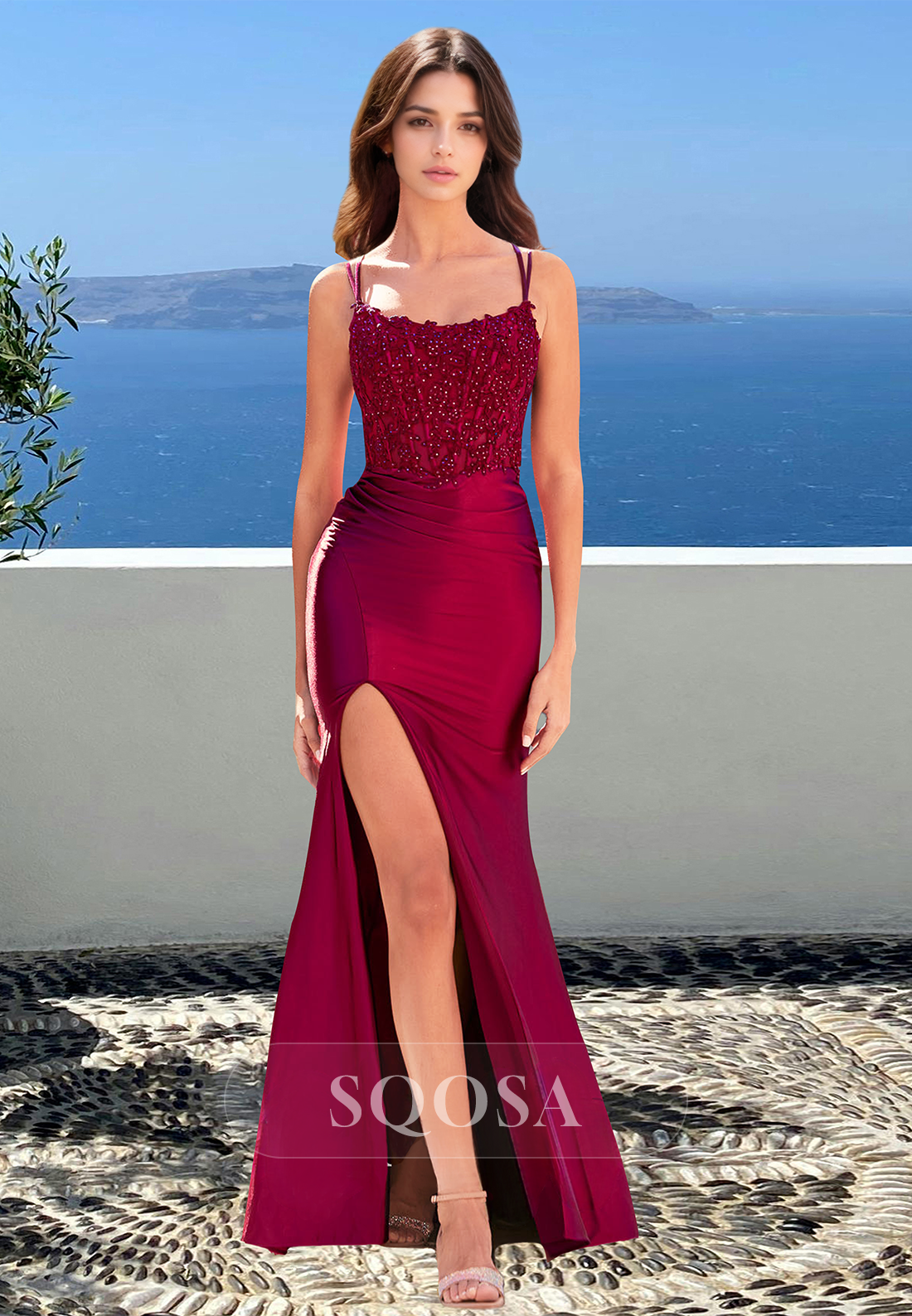 Scoop-Neck Off-Shoulder Sleeveless Party Gowns Spaghetti Straps Beaded Applique Mermaid Prom Dress