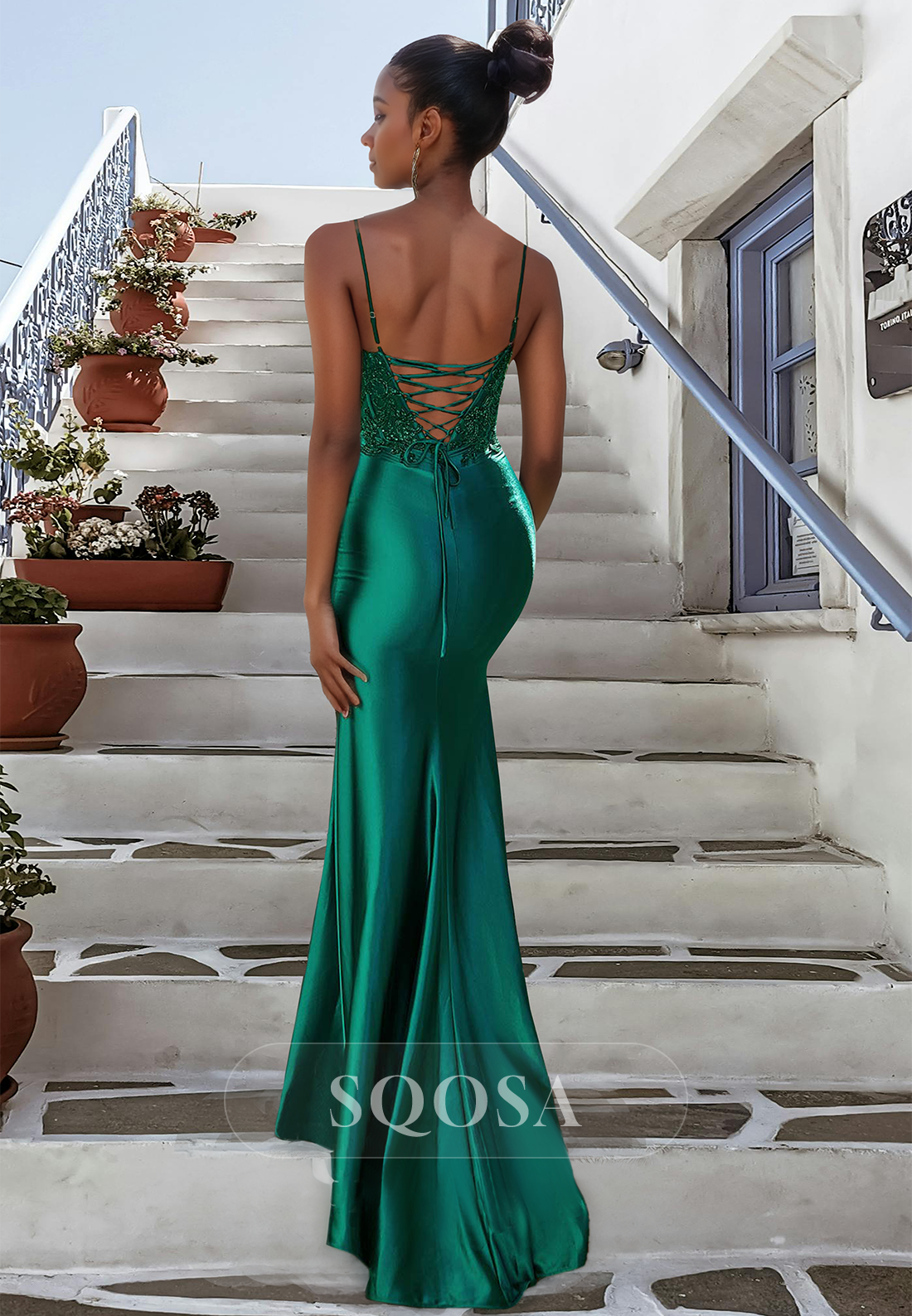 V-Neck Off-Shoulder Sleeveless Pleated Mermaid Prom Dress Spaghetti Straps Beaded Applique Formal Gowns