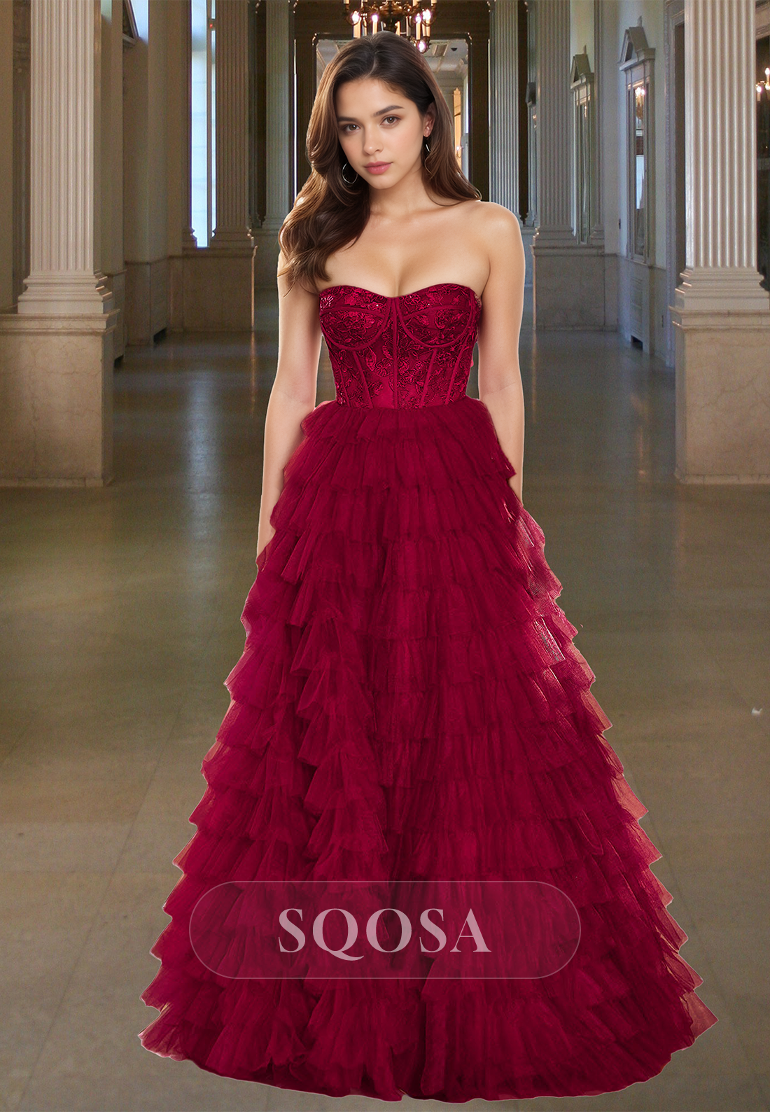 Off-Shoulder Sweetheart Sleeveless A-Line Prom Dress Beaded Applique Tulle Tiered Formal Gowns