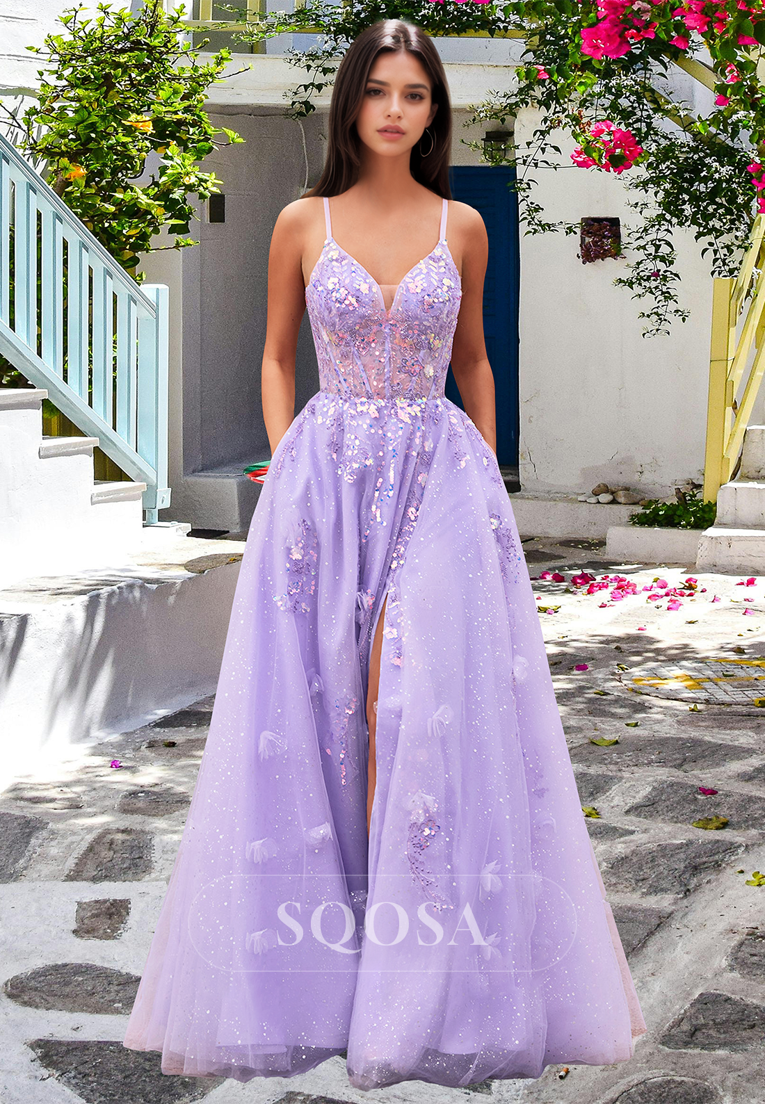 Spaghetti Straps V-Neck Off-Shoulder Sleeveless Glitter-Knit Applique Beaded A-Line Prom Dress