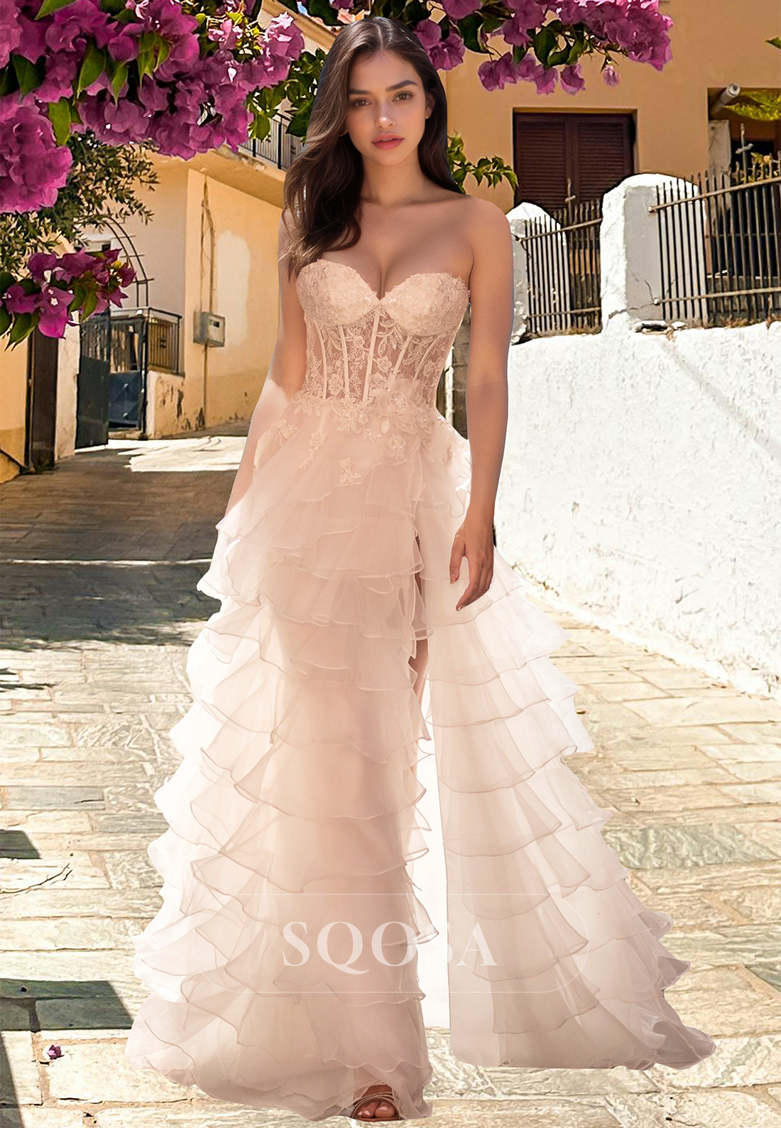 A-Line Sweetheart Sleeveless Off-Shoulder Chiffon Prom Dress Beaded Lace Applique Tiered Evening Gowns