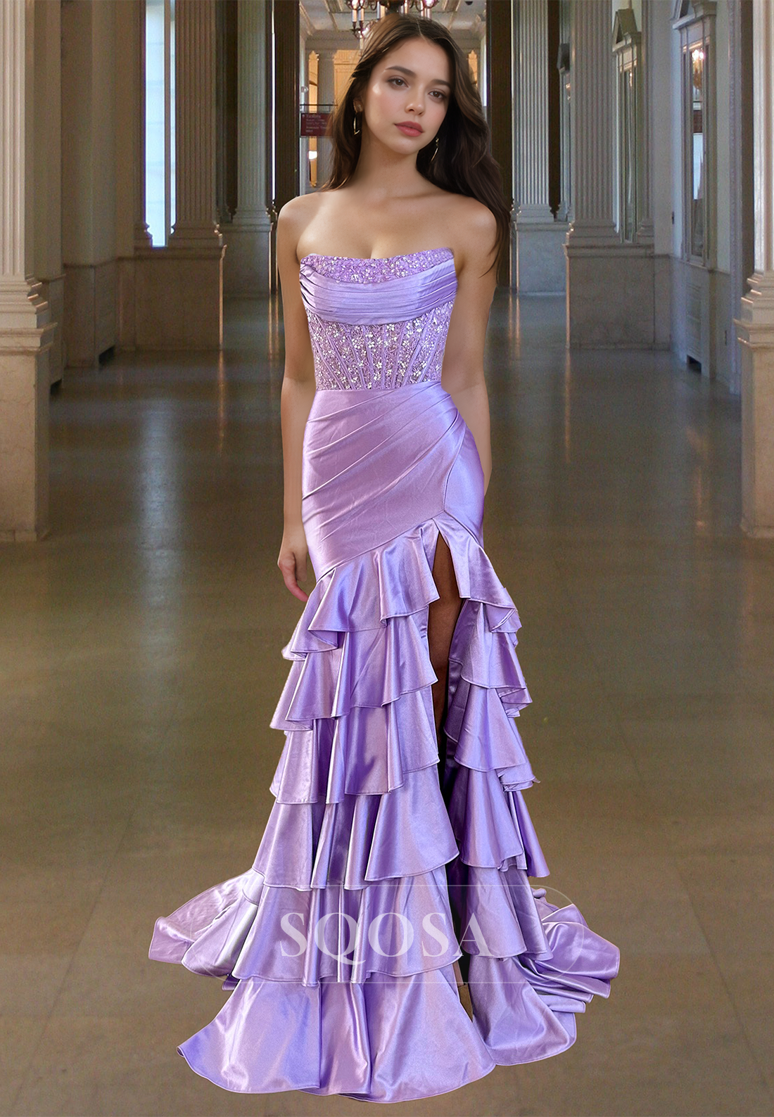 Tube Top Off-Shoulder Sleeveless Tiered Mermaid Prom Dress Beaded Sequined Pleated Party Gowns