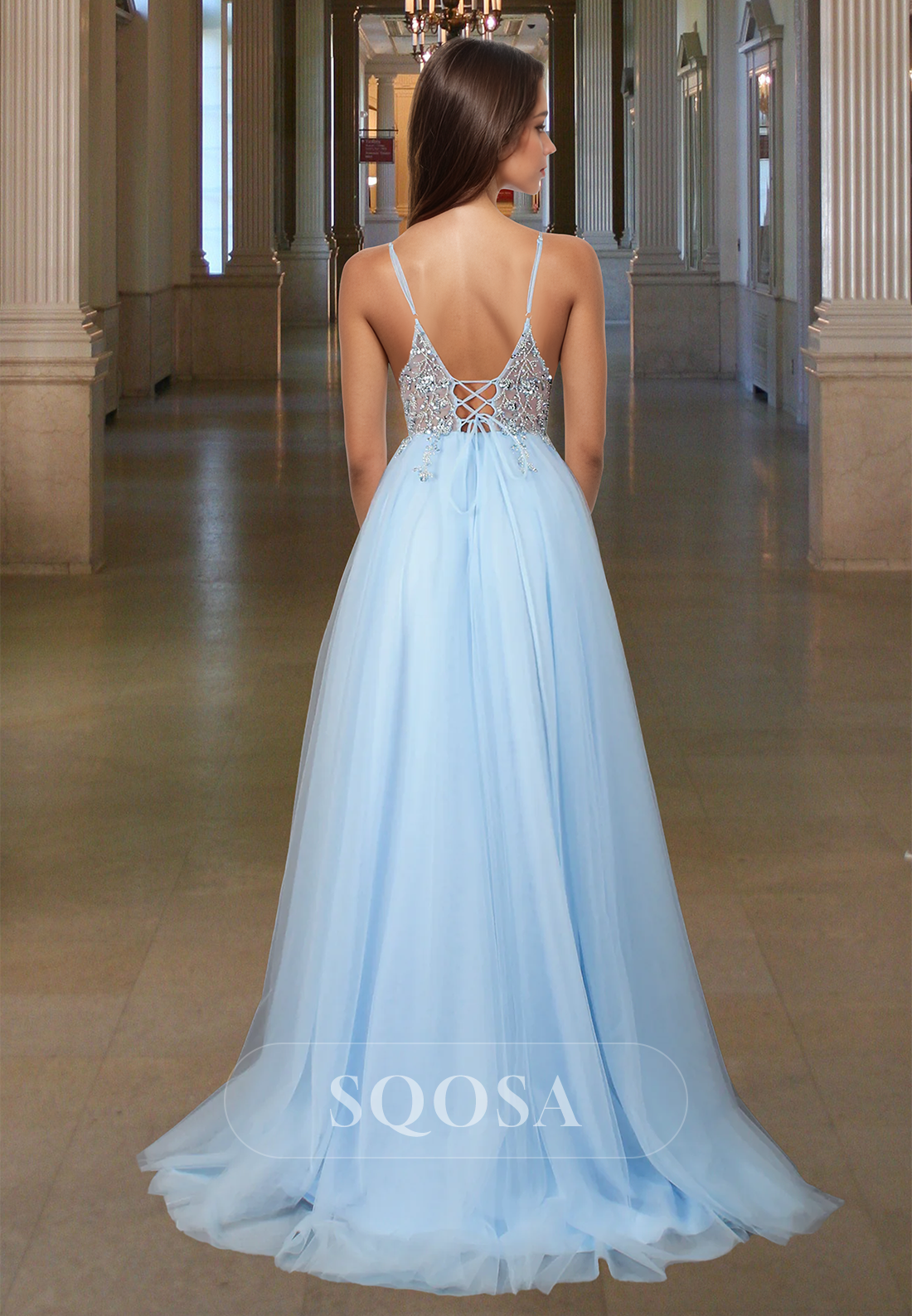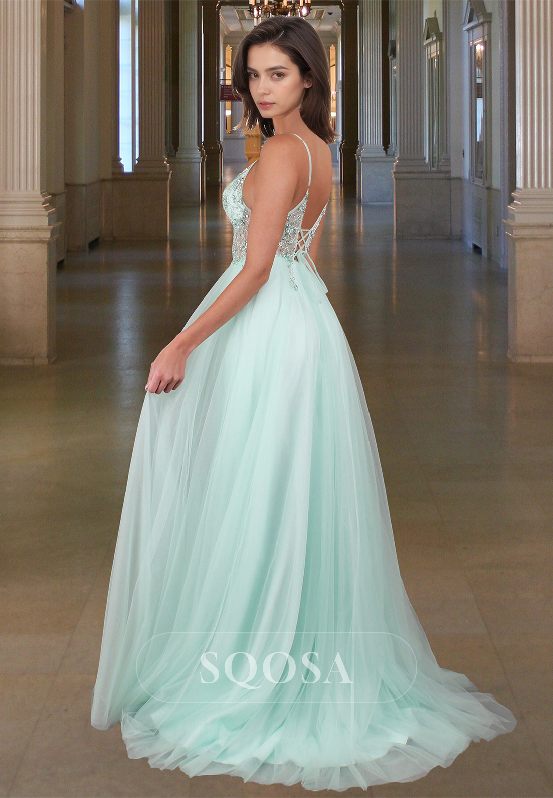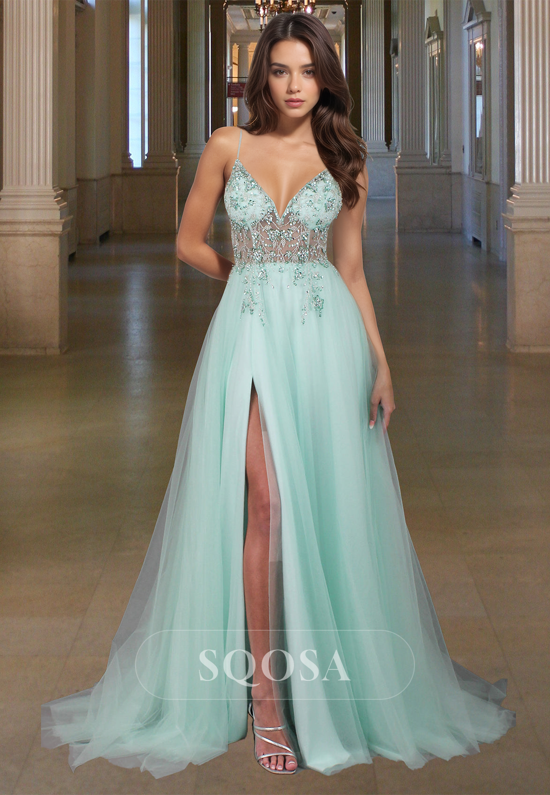 V-Neck Spaghetti Straps Sleeveless Glitter Applique Pleated Tulle A-Line Prom Dress with High Slit