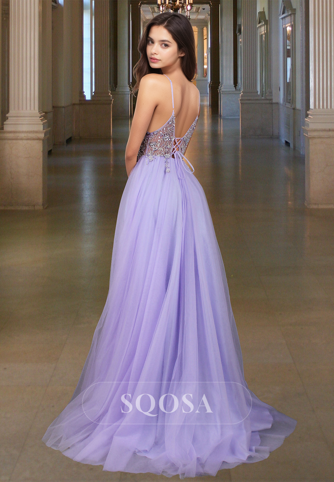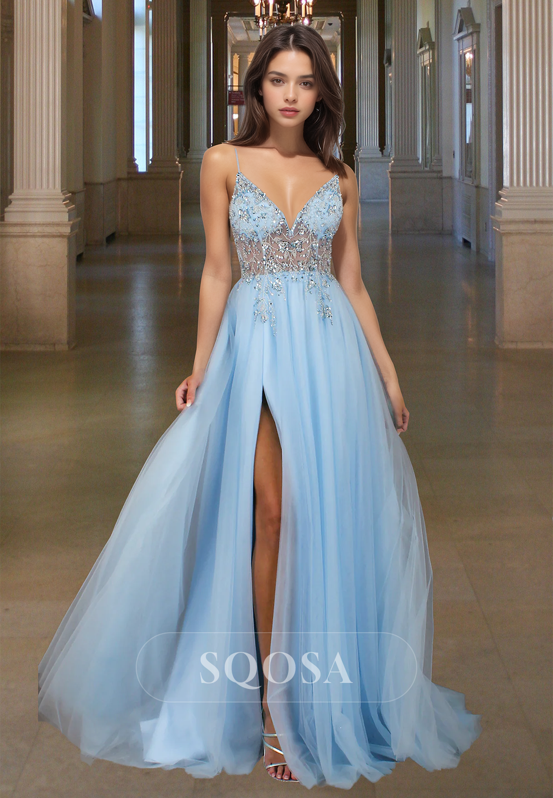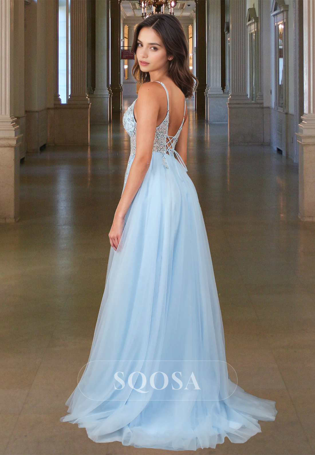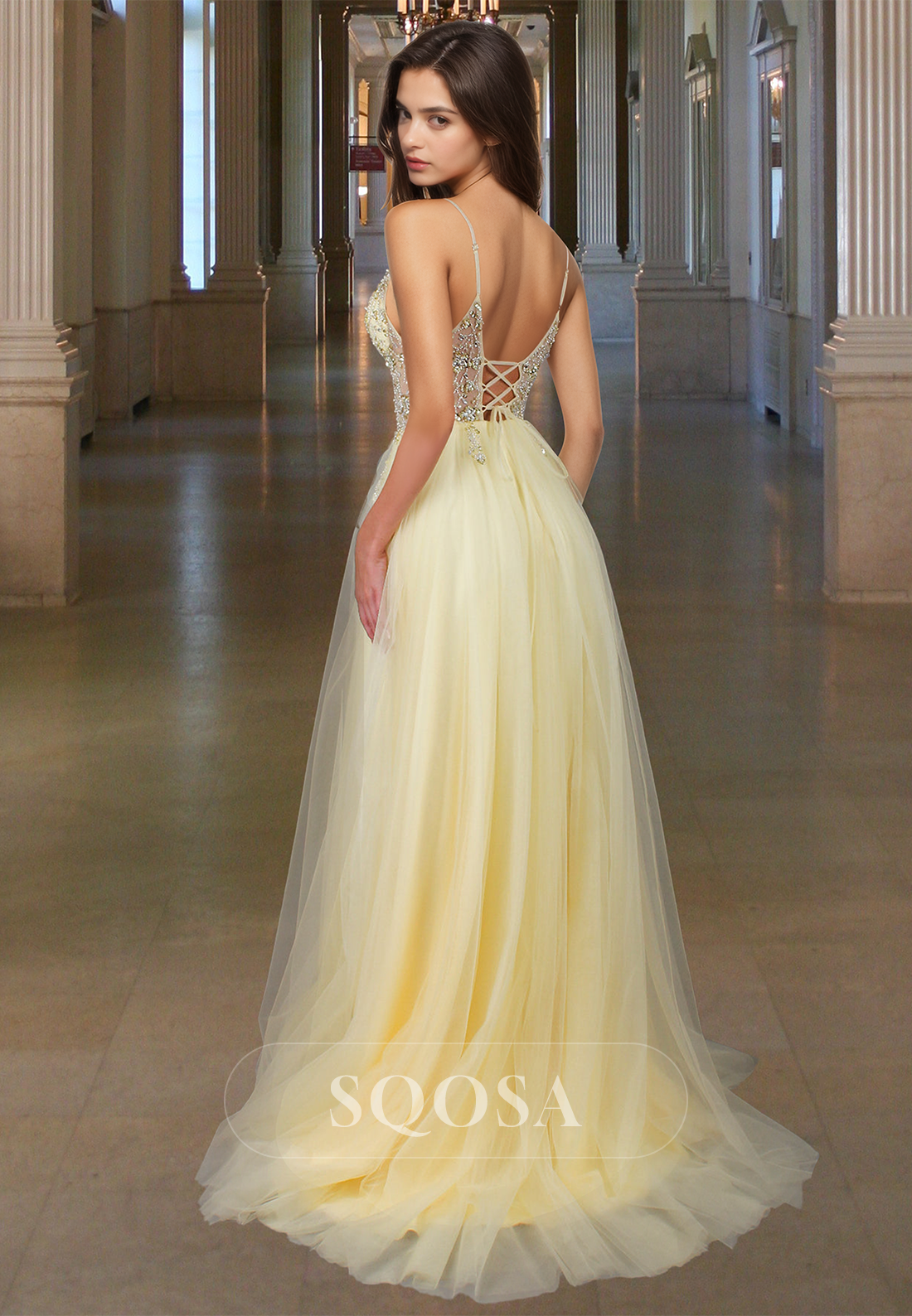 V-Neck Spaghetti Straps Sleeveless Glitter Applique Pleated Tulle A-Line Prom Dress with High Slit