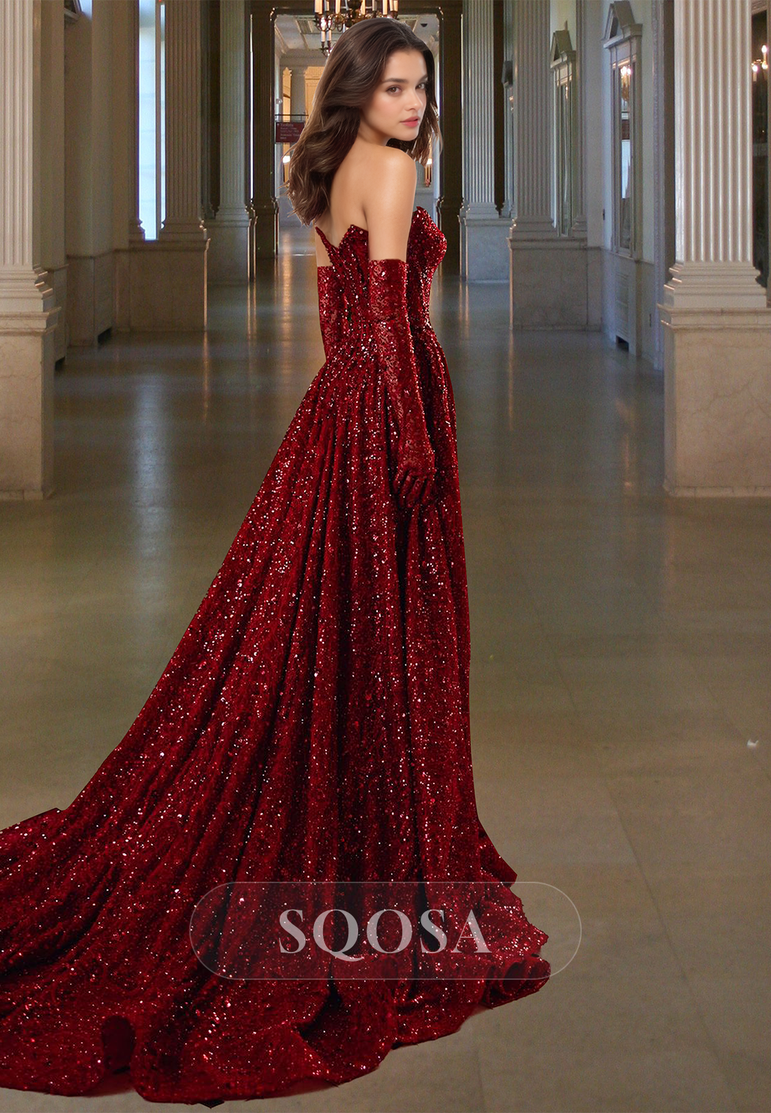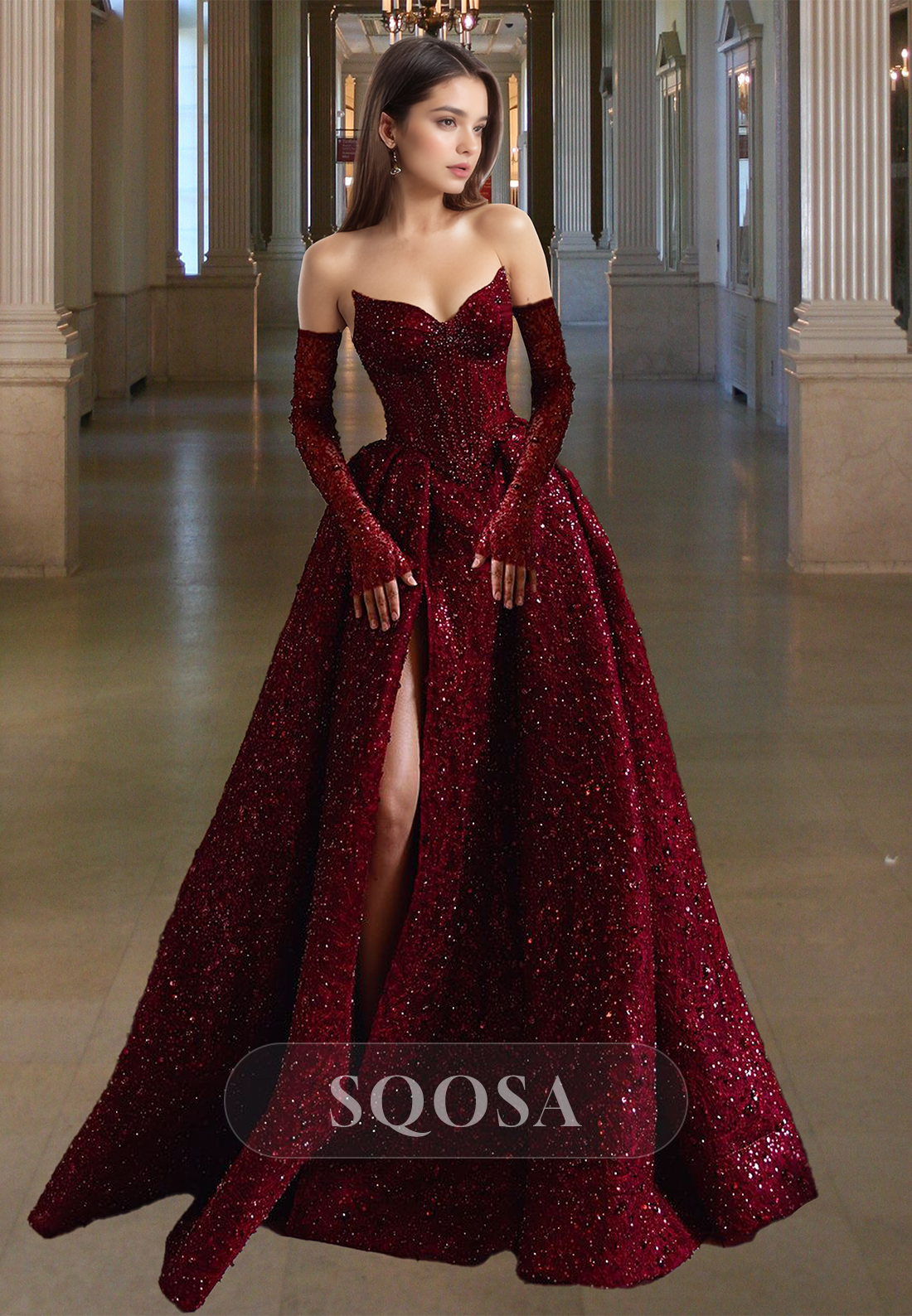 Sweetheart Off-Shoulder Sleeveless Party Gowns Fully Sequined Pleated A-Line Prom Dress with Gloves