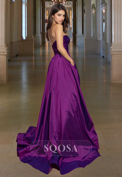 Simple Off-Shoulder Sleeveless Pleated Party Gowns Sweetheart Satin High Slit A-Line Prom Dress