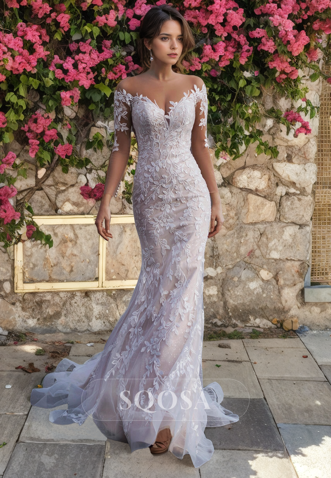Mermaid Illusion Neckline Lace Appliques Long Sleeves Mermaid Wedding Dress with Train
