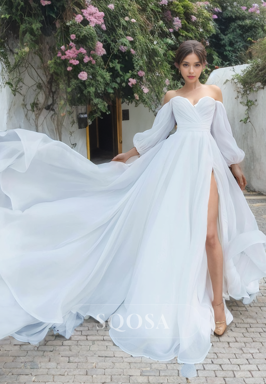 Long Sleeves A-Line Chiffon Wedding Dress Sweetheart Bridal Dress Slit with Train