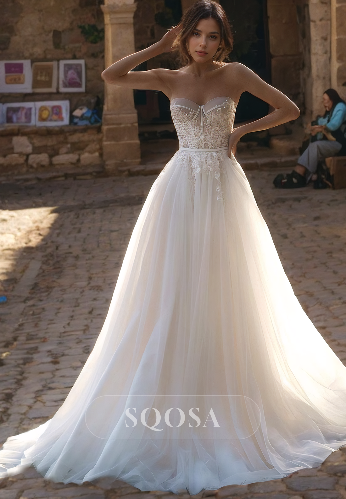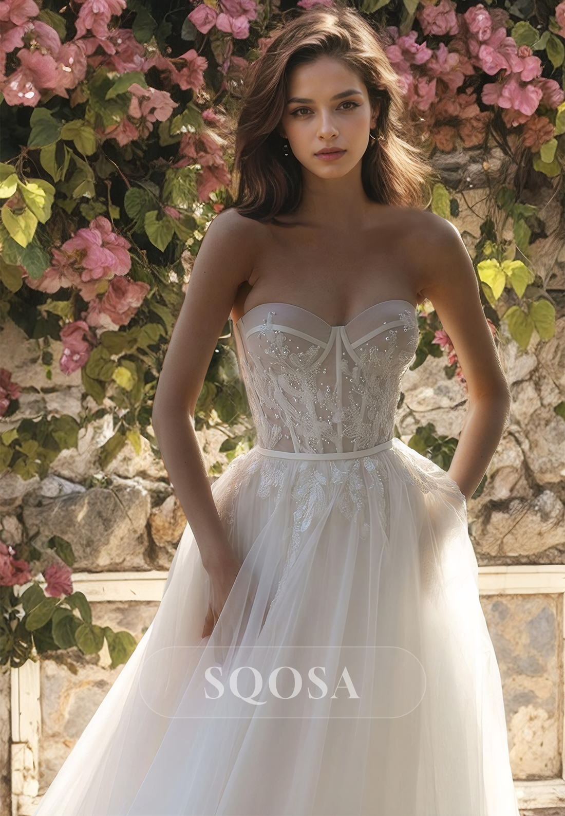 A-Line Sweetheart Floor Length Tulle with Beaded and Applique Wedding Dress
