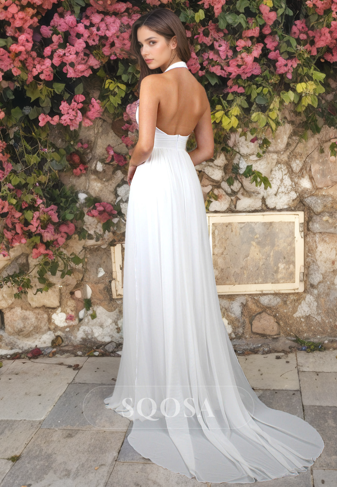 Couture Bride Dress V-Neck Straps Slit Chiffon with Long Train Wedding Gown