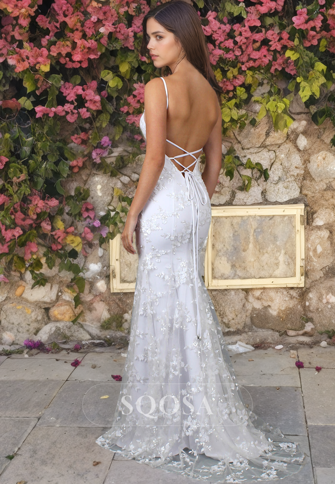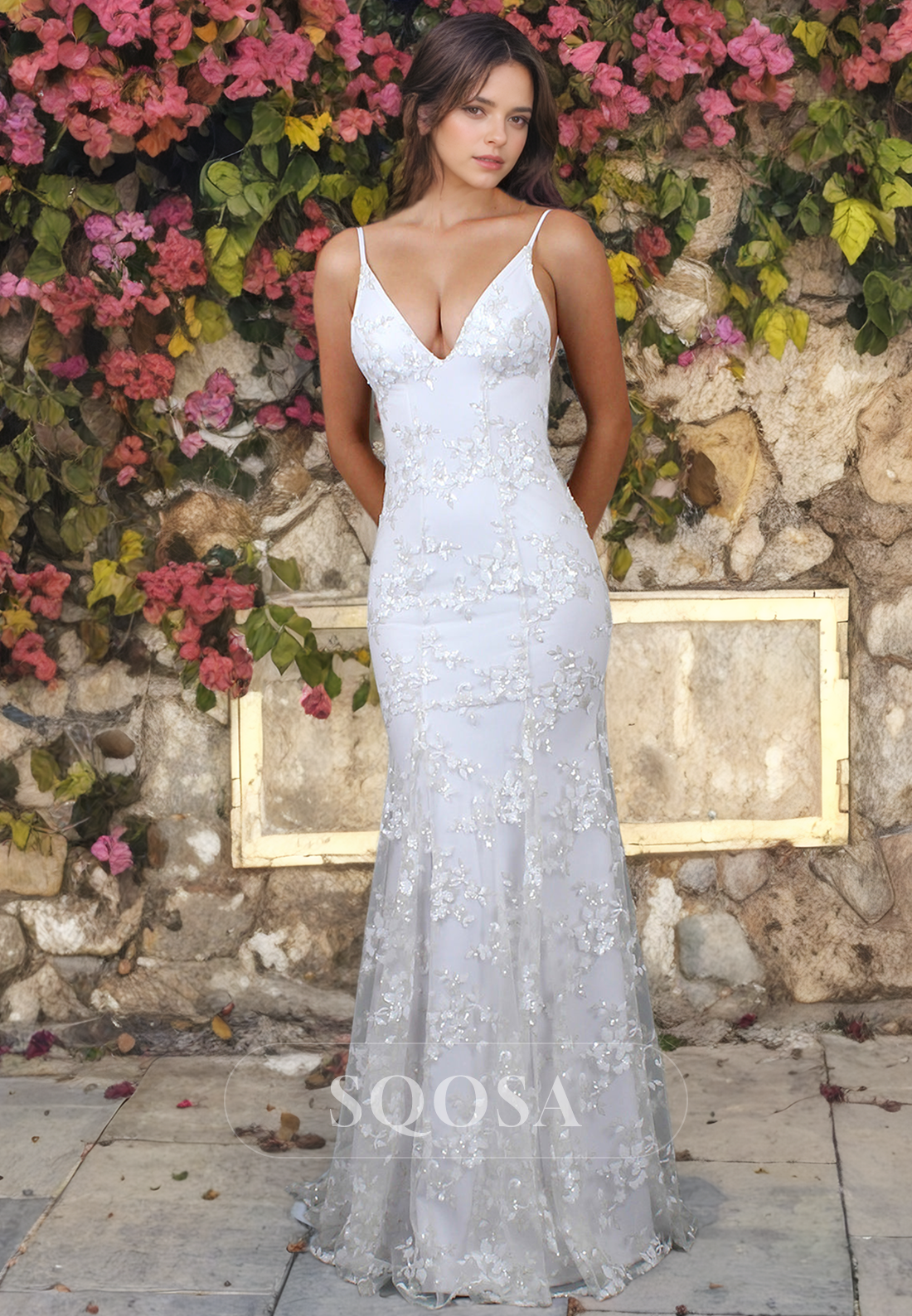 This V-neck mermaid bridal dress features a floor-length silhouette and delicate lace detailing, perfect for a beach wedding. The straps add a touch of elegance and support, while the mermaid design accentuates your figure. Make a statement with this stylish and sophisticated choice for your special day.