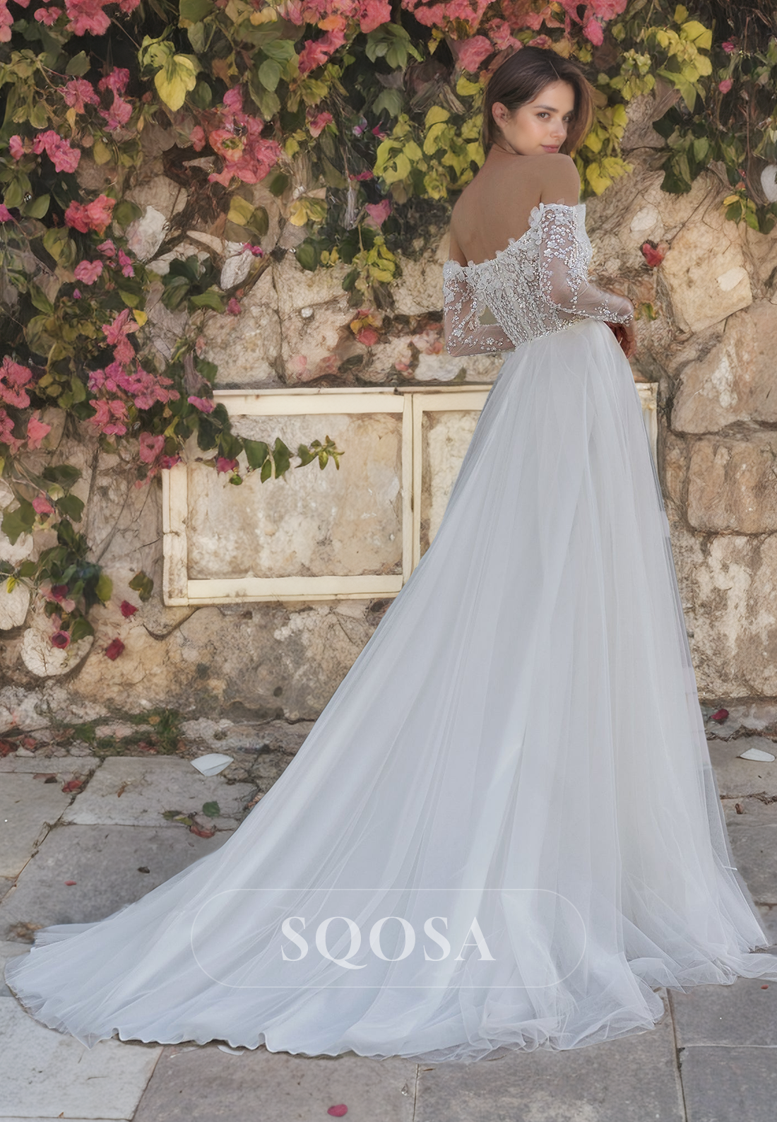Expertly crafted with an A-line silhouette, off-shoulder design, and beaded long sleeves, this wedding dress is a stunning choice for modern brides. The flowing train adds a touch of elegance, while the tube top offers a comfortable and secure fit. Elevate your special day with this beautiful gown.