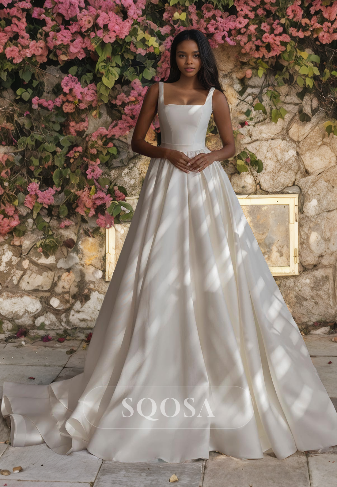 A-Line Squar-Neck Satin Wedding Dress with Train Simple Straps Bridal Gowns